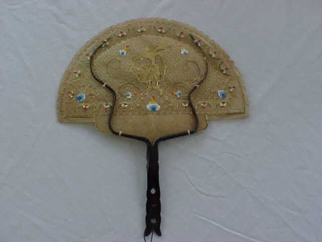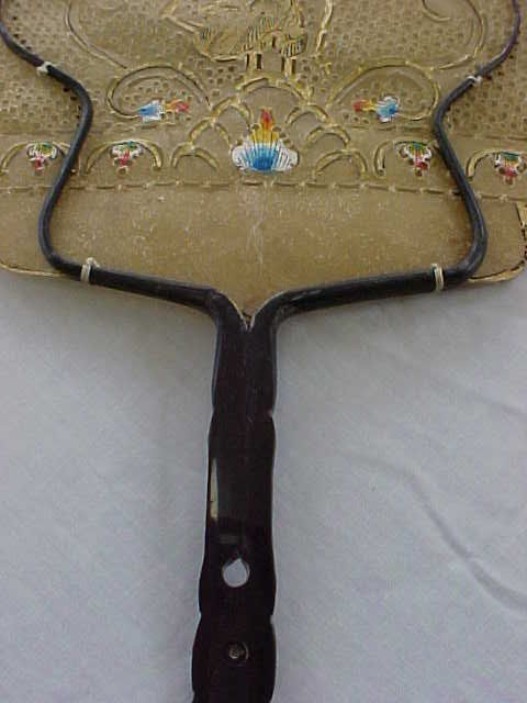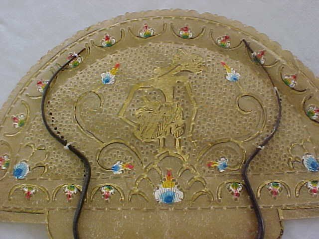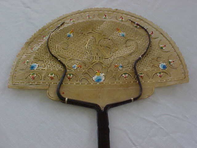 fan #5. rare, mid to late 19th century Javanese Rama Wayang Kulit Water Buffalo Fan. perfect condition (see pictures) the painted scene depicts the likeness of Rama, the central person in the epic Ramayana. dried Buffalo Hide, the handle and frame are from finely carved buffalo bone, split at sides to hold fan.