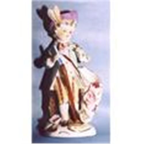 Figural statue/vase of a sweet little boy in traditional dress, with lavender hat and aqua waist coat.