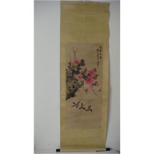 Chinese Ink on paper Scroll Painting.Attributed to yu wenhua( Chinese ).Flowers and Birds Painting, over all in good condition, 40" X 17" painting itself.
