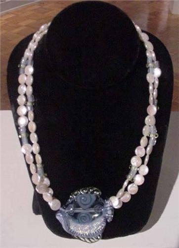 Barbara Simon earned a BS in Art Education and an MFA in metalwork and jewelry. She has been a goldsmith for over thirty-five years and has taught at University of Wisconsin-Menomonie and Iowa State University. She held a position of Professor in the Fine Arts Department at Edison Community College, from 1991 through 2000. Presently she crisscrosses the United States as a Senior Instructor for the Rio Rewards Precious Metal Clay Certification Program. Simon has traveled to Japan to teach PMC. In 2001, her necklace earned the Grand Prize in "Millennial Metal, The Art of Precious Metal Clay" held in Connecticut. Simon has also gained a national reputation for her lamp worked glass beads and jewelry. <BR>Fish is a necklace with a handmade, lamp worked focal bead in the shape of a fish that is hung with seed beads, freshwater pearls and other lamp worked beads. <BR>