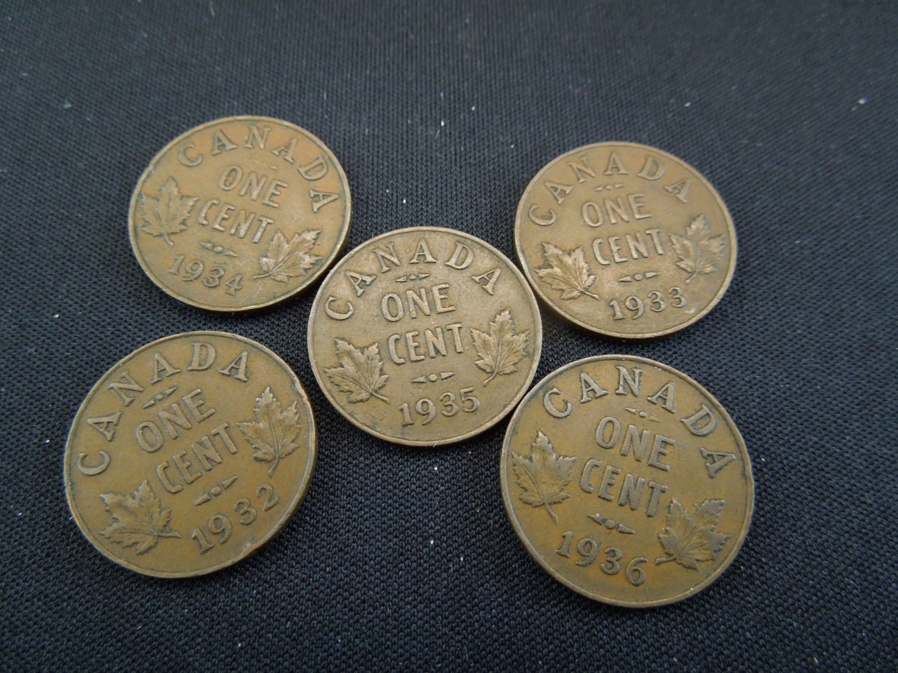 five candian small cents dated 1932-1936