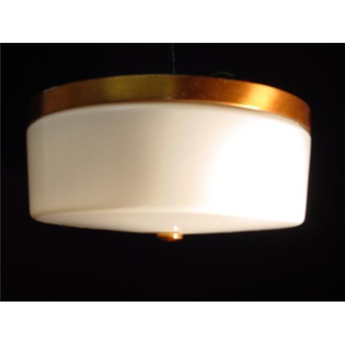 Circa 1940 Drum shaped copper ceiling fixture with milk glass lens.Two available in chrome finish.