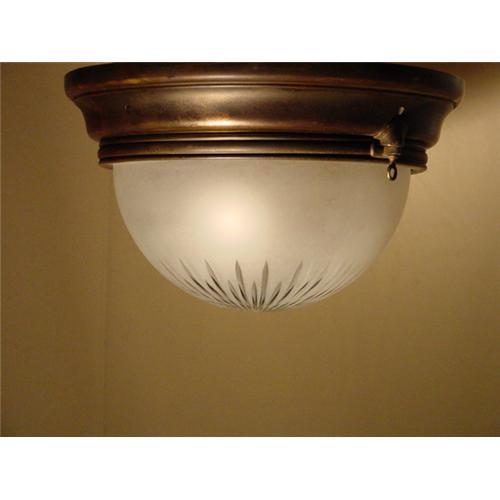 Circa 1920 A flush-mounted light fixture with brass rim and wheel-cut frosted glass lens.