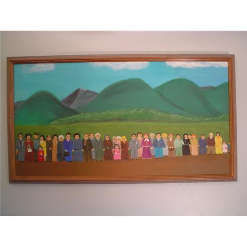 Folk Art- oil on canvas & signed "Lou '92". Family portrait painting in very good condition. Measures 19"x34". Without a doubt a very different type of folk art painting.