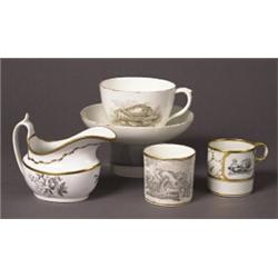 1) Minton, Stoke, Staffordshire, circa 1846. Shell motif breakfast cup and saucer (ck).2) Floral motif creamer; coffee can with leopards attacking horse (hck); coffee can with mythological figures on a gilded marble-look ground (several worn).Height of creamer 9.5 cm. (3 3/4 in.).Literature: Minton item illustrated in E. Collard, 19th Century Pottery and Porcelain in Canada (1st edition), plate 17B.