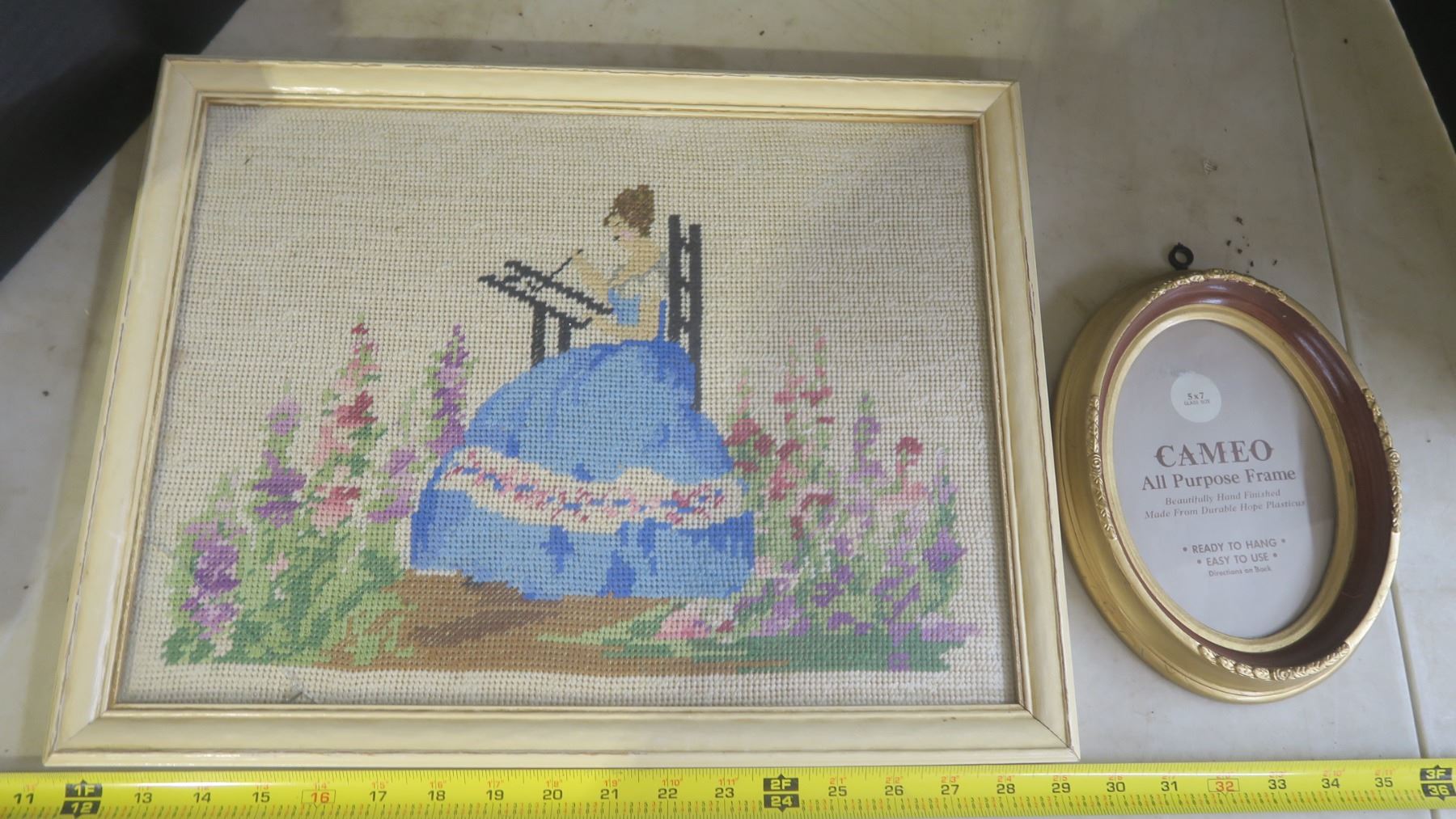 framed cross-stitch and oval frame - crack in glass, 18"x13.5"