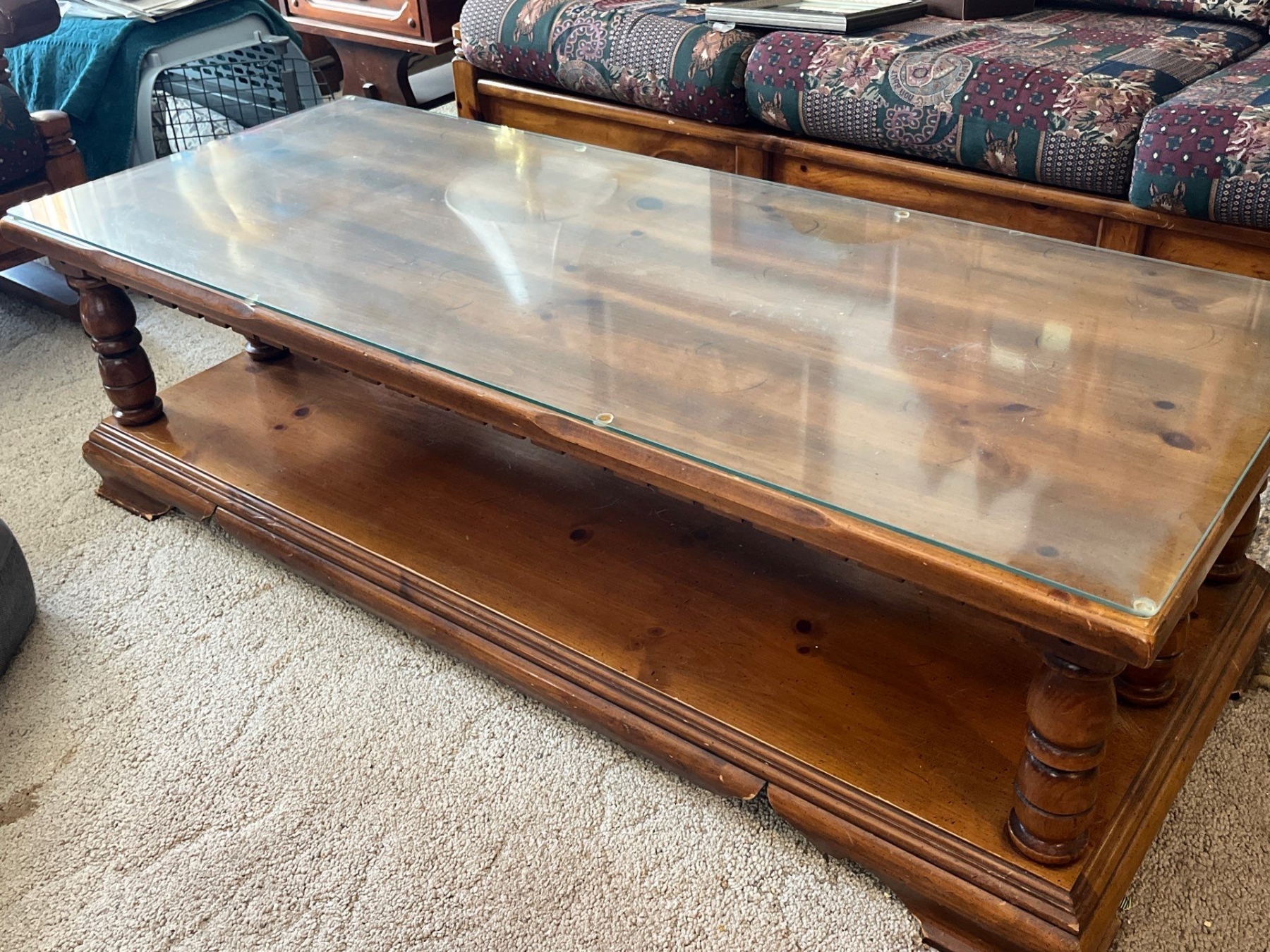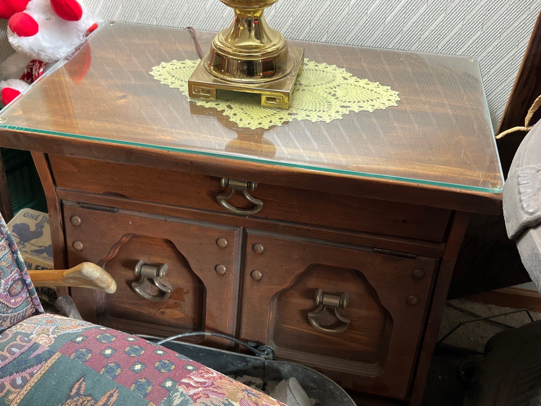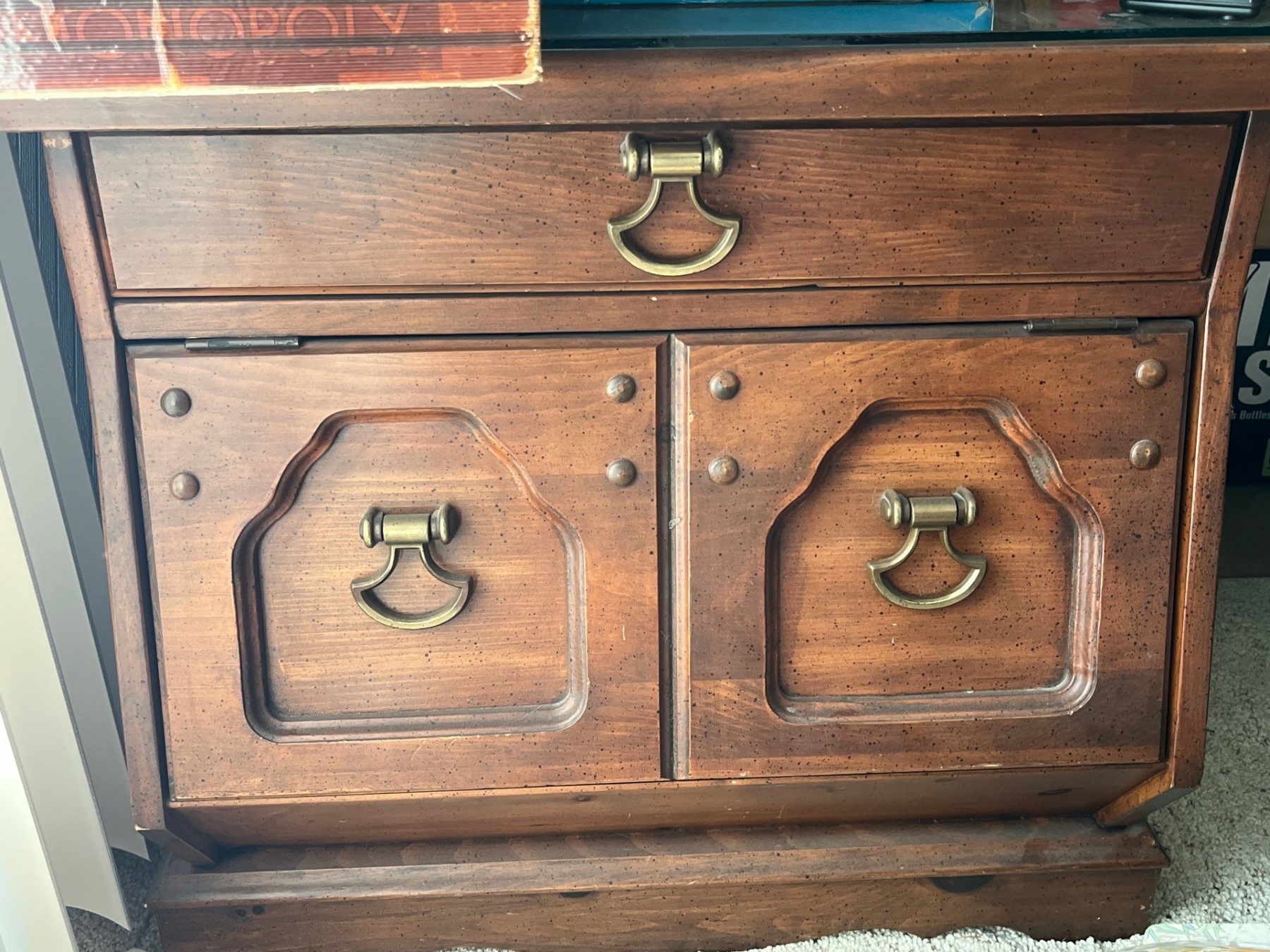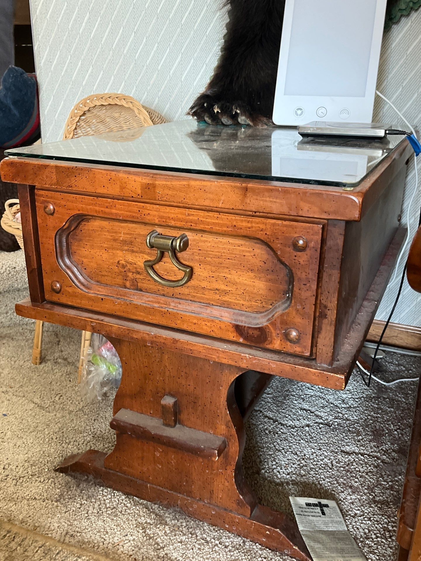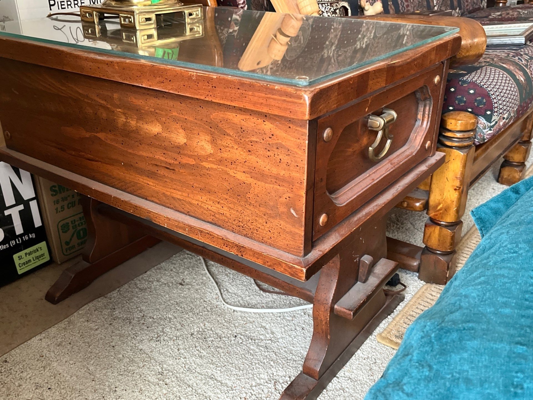 full set of Vintage-Retro end tables 21” h 27”d x19 w coffee table 16”h 21”w 54 Land two small storage end tables 24H 25” w 15” D all solid wood in great condition all have custom glass tops.
