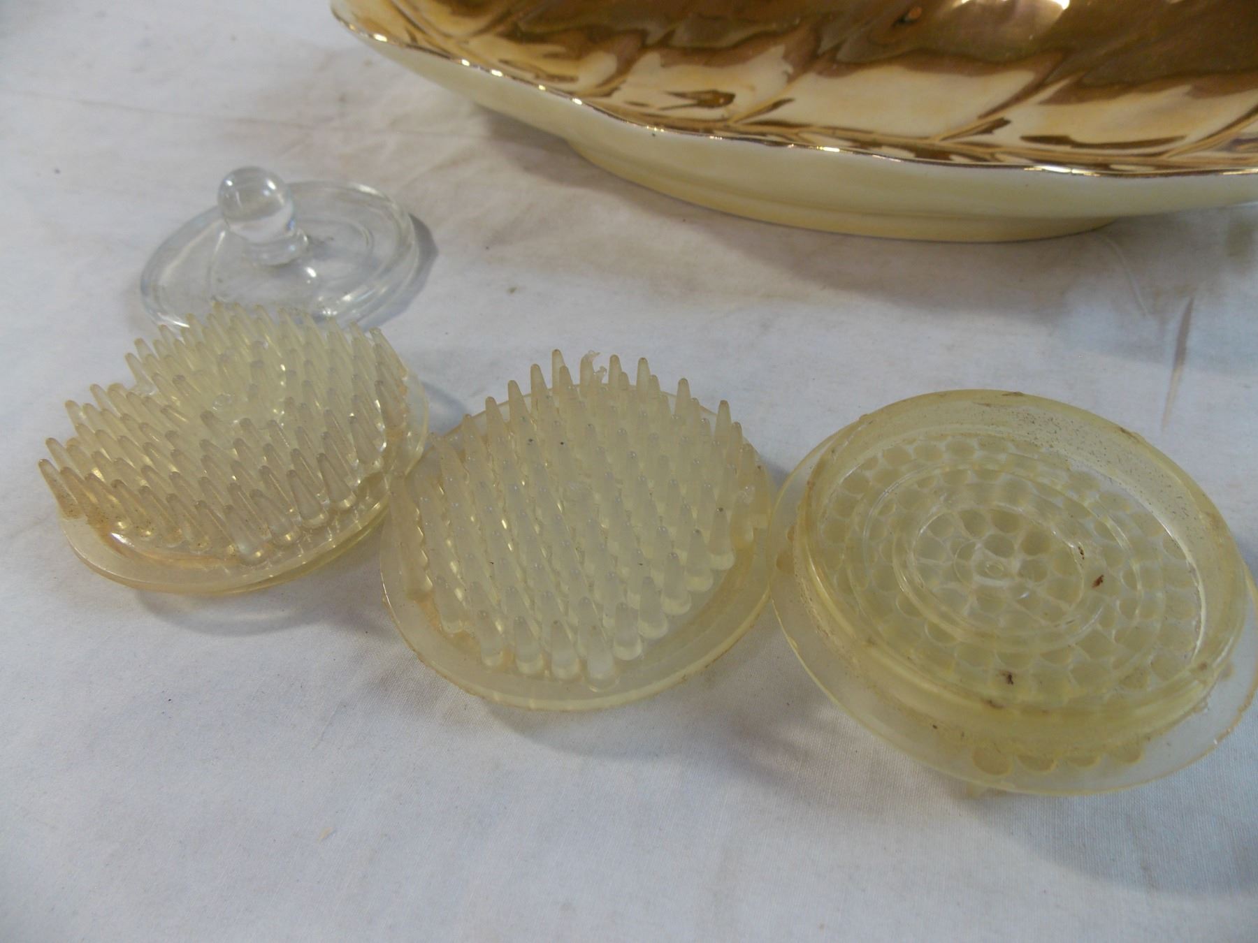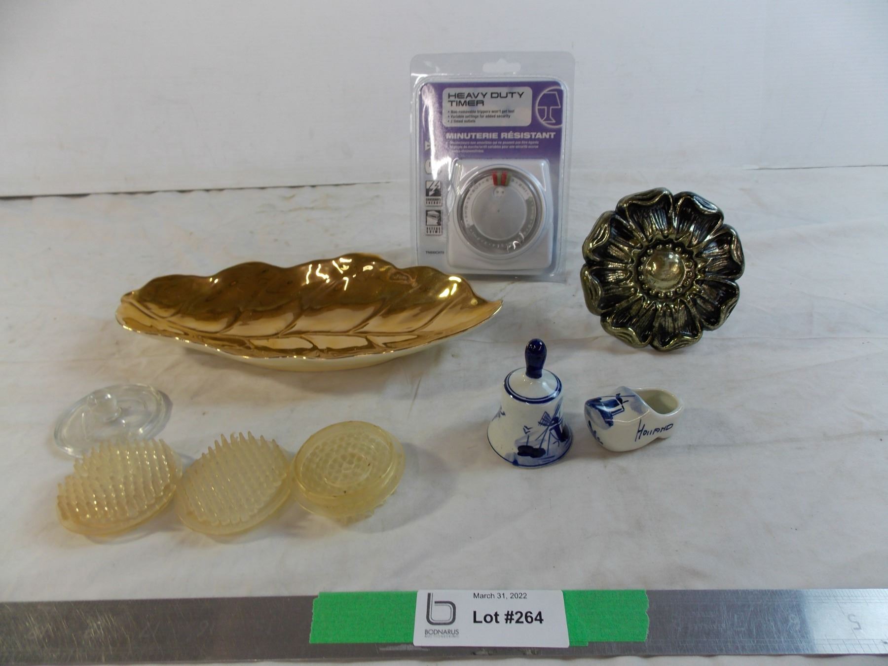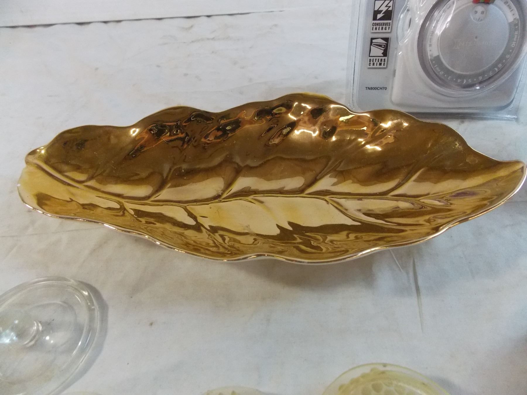 gold leaf dish, misc items, heavy duty timer