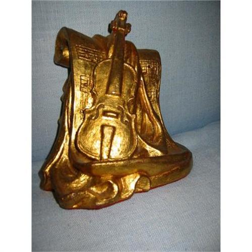 magnificent, gorgious, decorative, vintage/antique bookend or sculpture or even paper weight. gold plated on composite or plaster. beautiful and in good condition, with violin and music note pattern and red felt on the base. some wear and tear. 8 " T. - 9 " W.