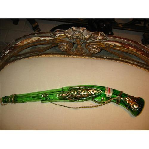 Another Unique Finds, an attractive- gorgious decanter in shape of pistol with two separate mark on the sides and numbered on the end. cork is attached to a piece of natural thread / thin Rope and is very decorative. great bar accessory. one mark reads Barsottini Vino Rosso - product of Italy Bottled by Casa Vinicola poccacio Barsottini fedeli Coridaldo Firenze. and the other side reads Imported by Banfi Products Corp. Farmingdale N.Y. Sale U.S. Agent Permit N 2-1-305. the bottle is empty and has been a wall decor! 17 " W. something to think about!