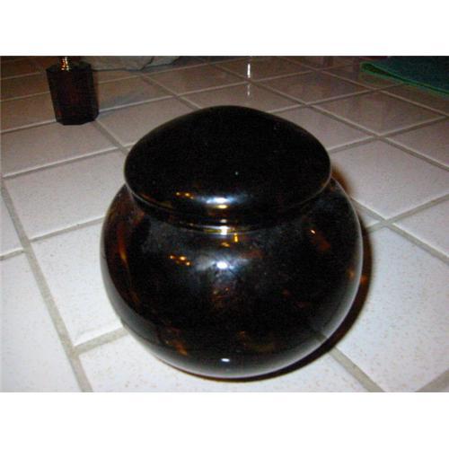 </font></strong>beautiful designer dark glass jar hand blown with dark spots splashed all over (leopard style). it is in excellent condition and measures 5 inch tall. it is gorgious, functional and collectible. great to accessorize the vanity station with it.something to think about! </font>