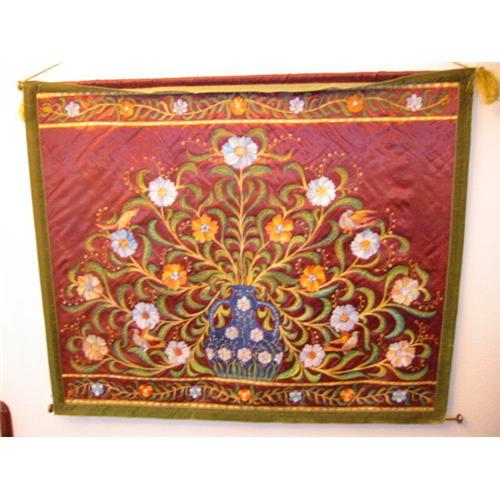 charming signed hand painted, silk wall decor is displayed on a brass rod with brass finials and finished with golden tassels. the color is soft lavender with green velvet trims. measures approximately 37.5 inches long and 46 inches wide. flowers are mostly white with accented red and yellow and blue. on two side with two birds which makes strong statements.the painting is in excellent condition. normal wear and tear. decorative and collectible.