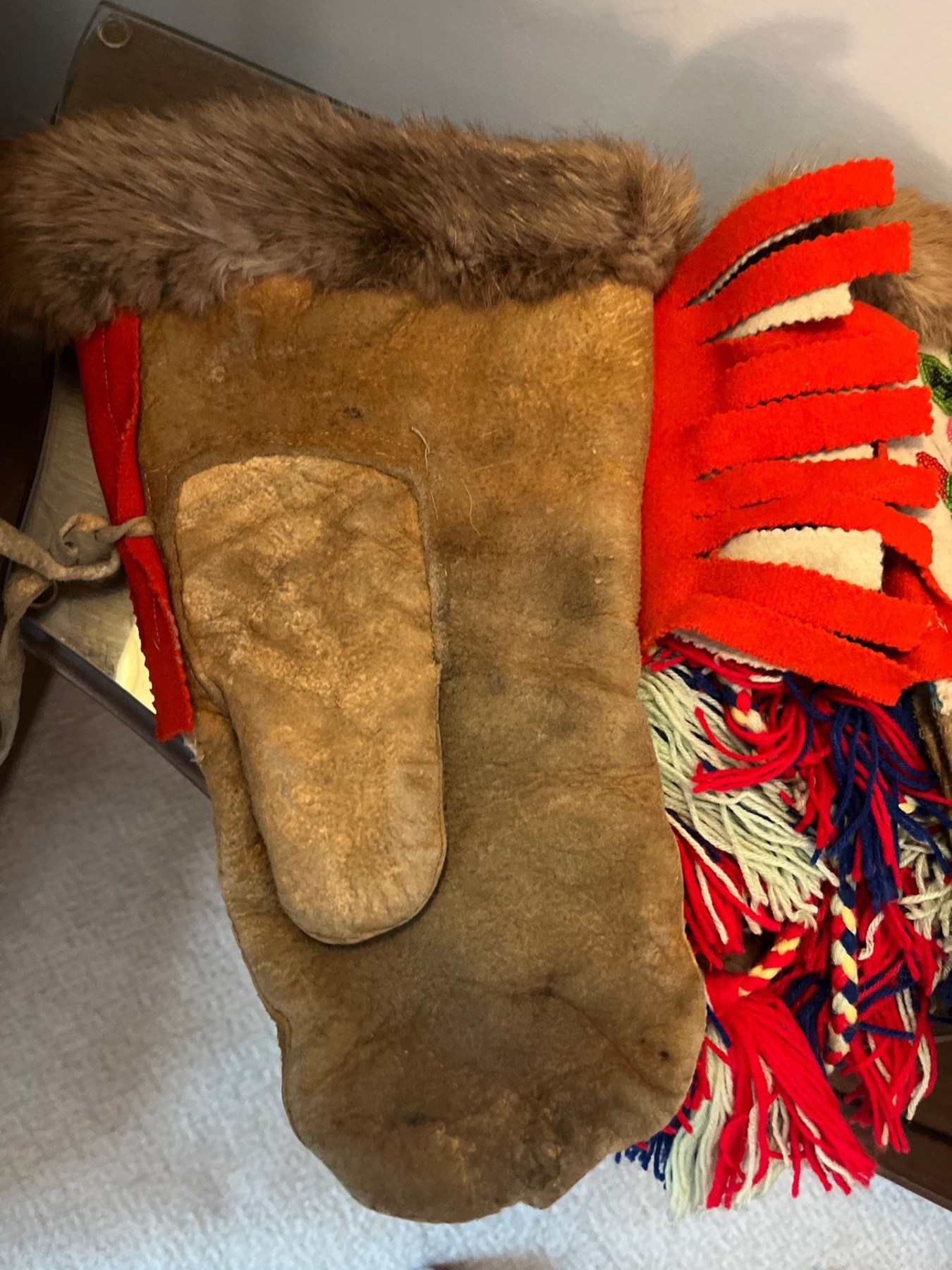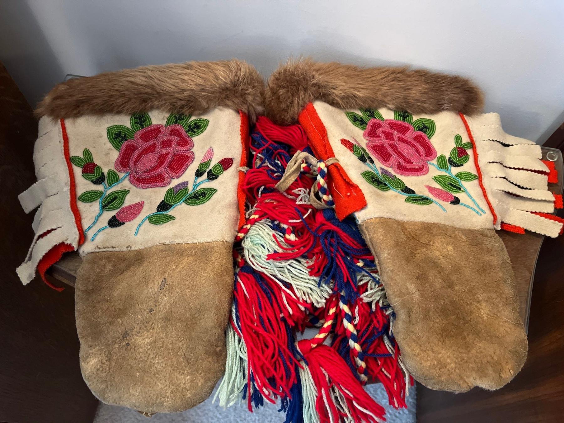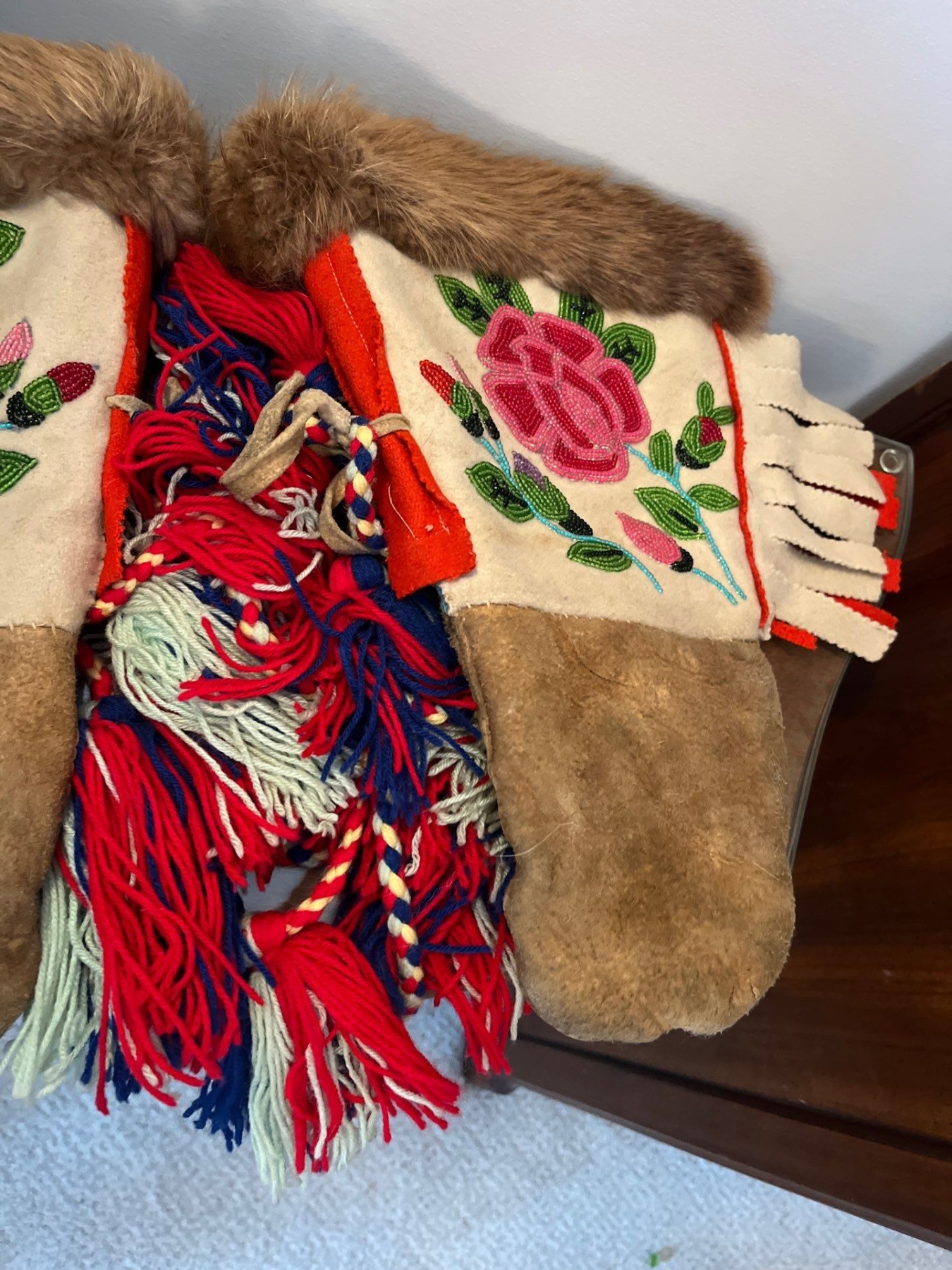 handcrafted indigenous mitts very beautifully detailed beaded fur lined in amazing condition.