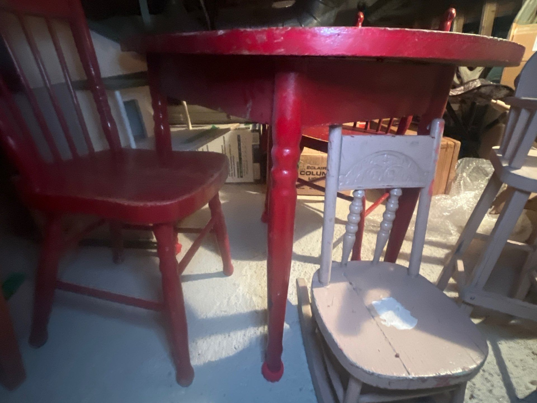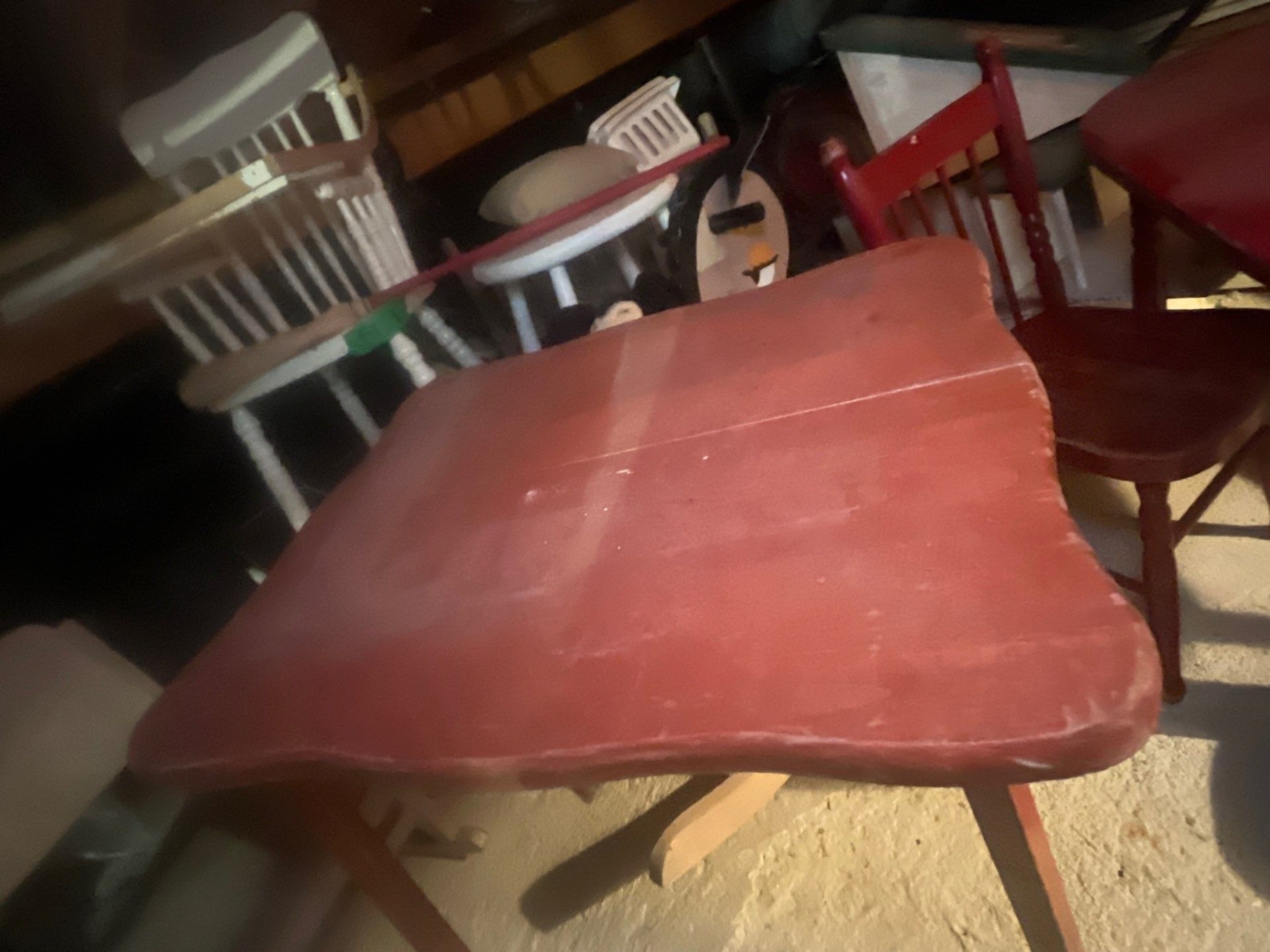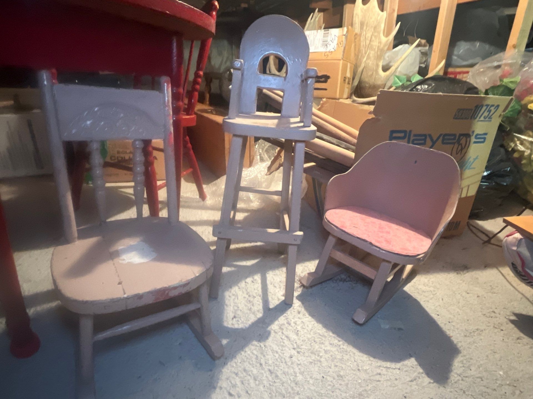 handcrafted, toddler tables, one red table, legs collapse to make flat other red table 2 small chairs along with three baby doll furniture, handcrafted, and a toddler rocking chair.