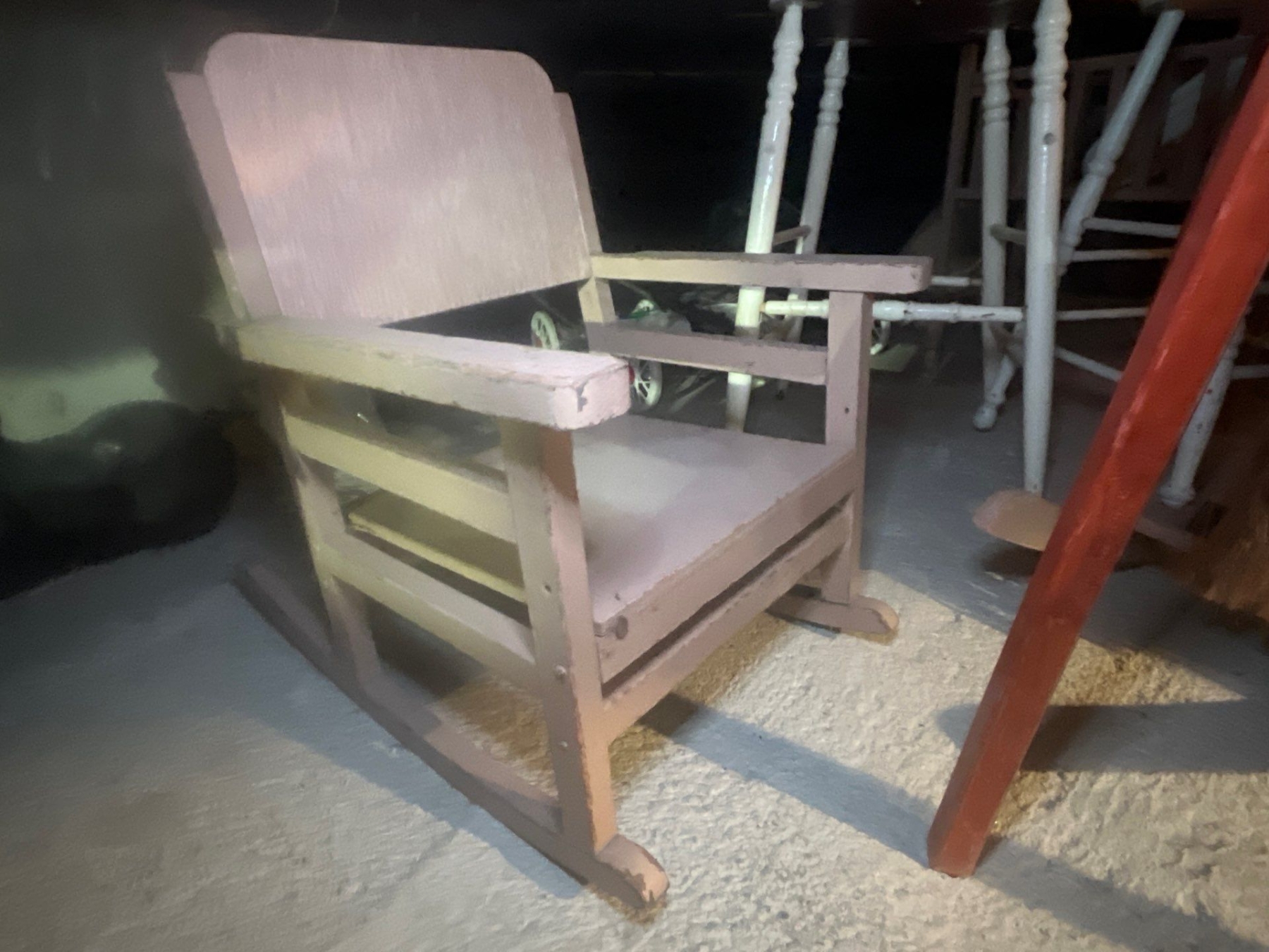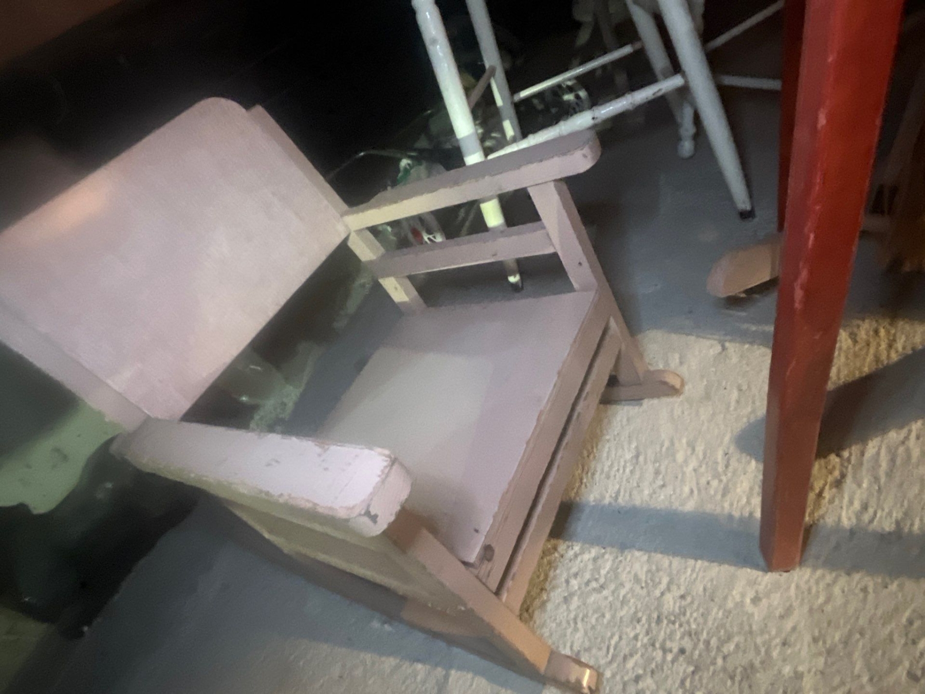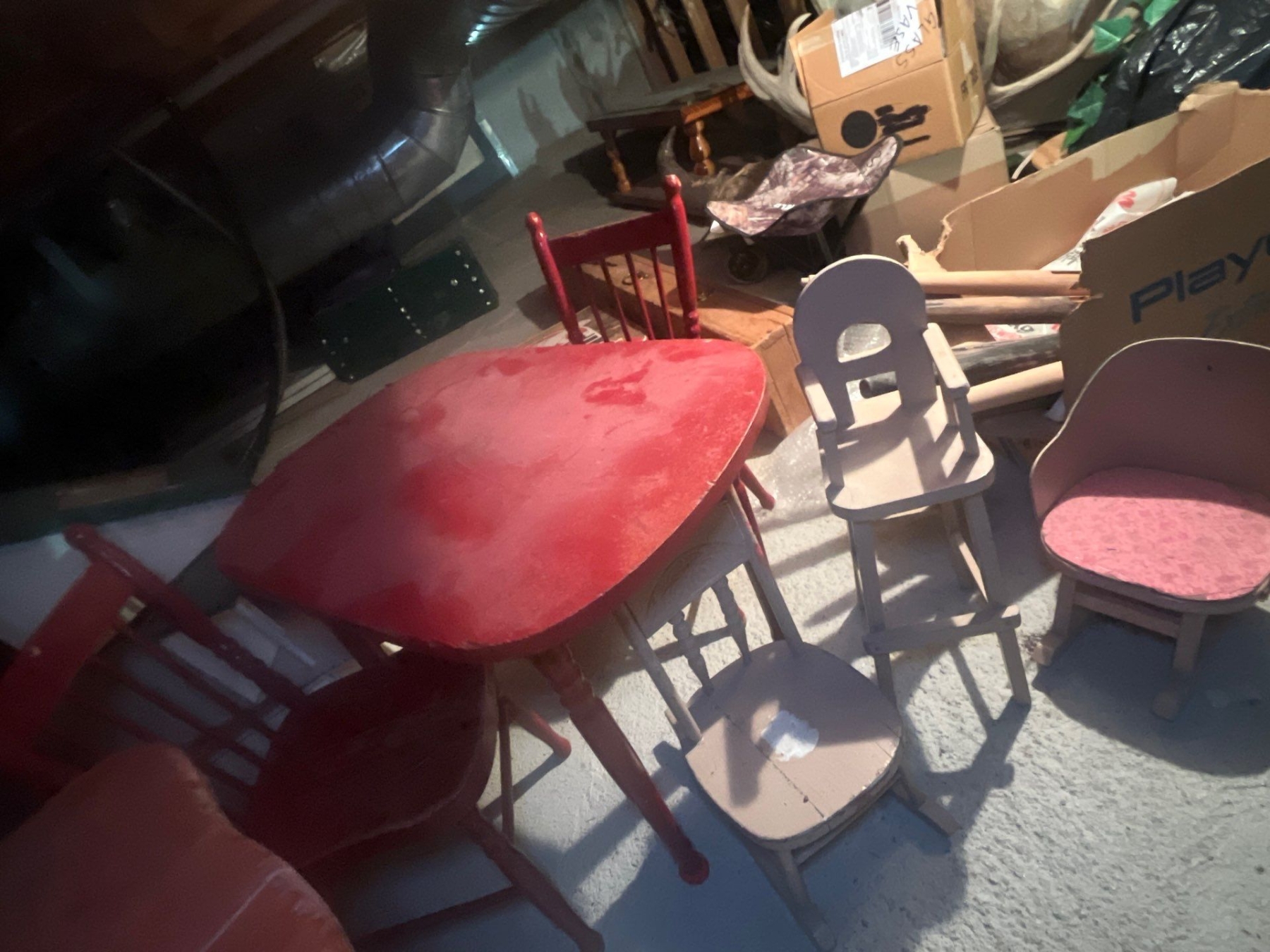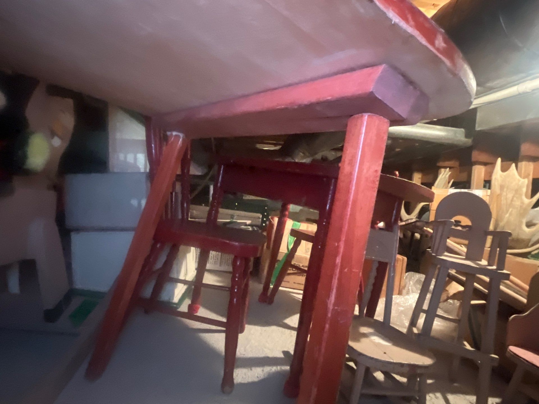 handcrafted, toddler tables, one red table, legs collapse to make flat other red table 2 small chairs along with three baby doll furniture, handcrafted, and a toddler rocking chair.