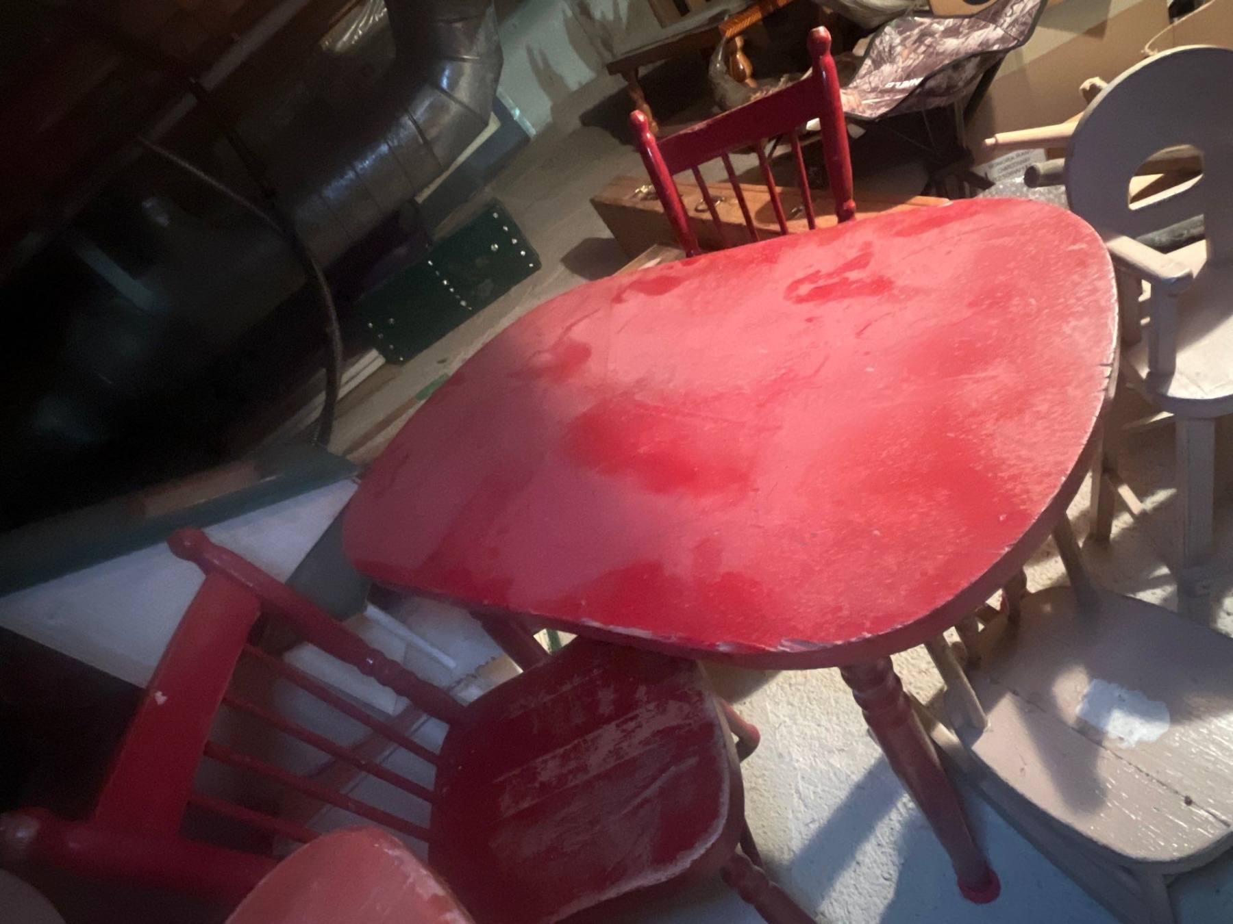 handcrafted, toddler tables, one red table, legs collapse to make flat other red table 2 small chai