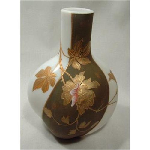 Outstanding gold overlay Harrach vase that stands 7" tall. It has a short 2 1/2" neck which gives it a bulbous body appearance. Beautifully done gold overlay work with a little enameling. The vase is numbered on the bottom in the polished pontil. No damage. Circa 1900.