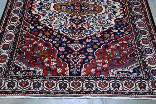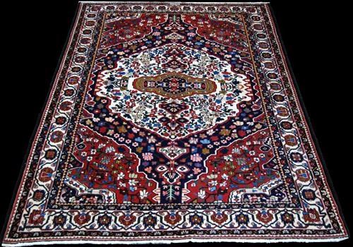 highly detailed 'desert order' persian bakhtiari. size 9.7 x 7 feet, made of fine quality lamb's wool pile on cotton foundation, all natural vegetable dye, incorporating a highly detailed floral pattern set upon different layers of red, black and off white backgrounds; a beautiful mustard colored centerpiece medallion; and an intricately done tribal floral border.  signed 'desert order' on the top of the rug, this unique authentic hand woven persian bakhtiari comes from a rural tribe in the middle of the desert.  hand woven in bakhtiar, iran.