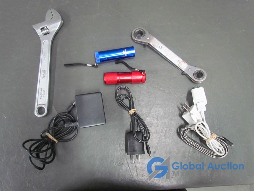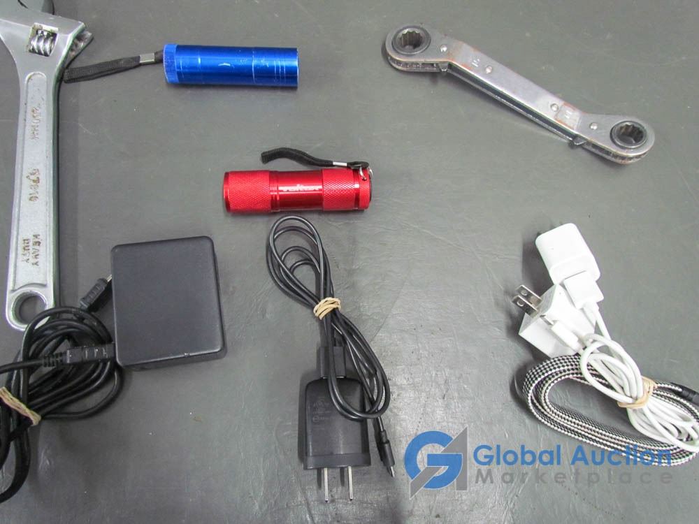 iPhone Chargers, Adaptor, USB Mini B Cord, MIni Flashlights, & Wrenches
