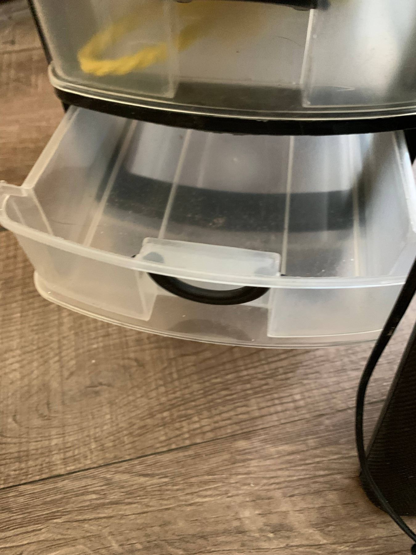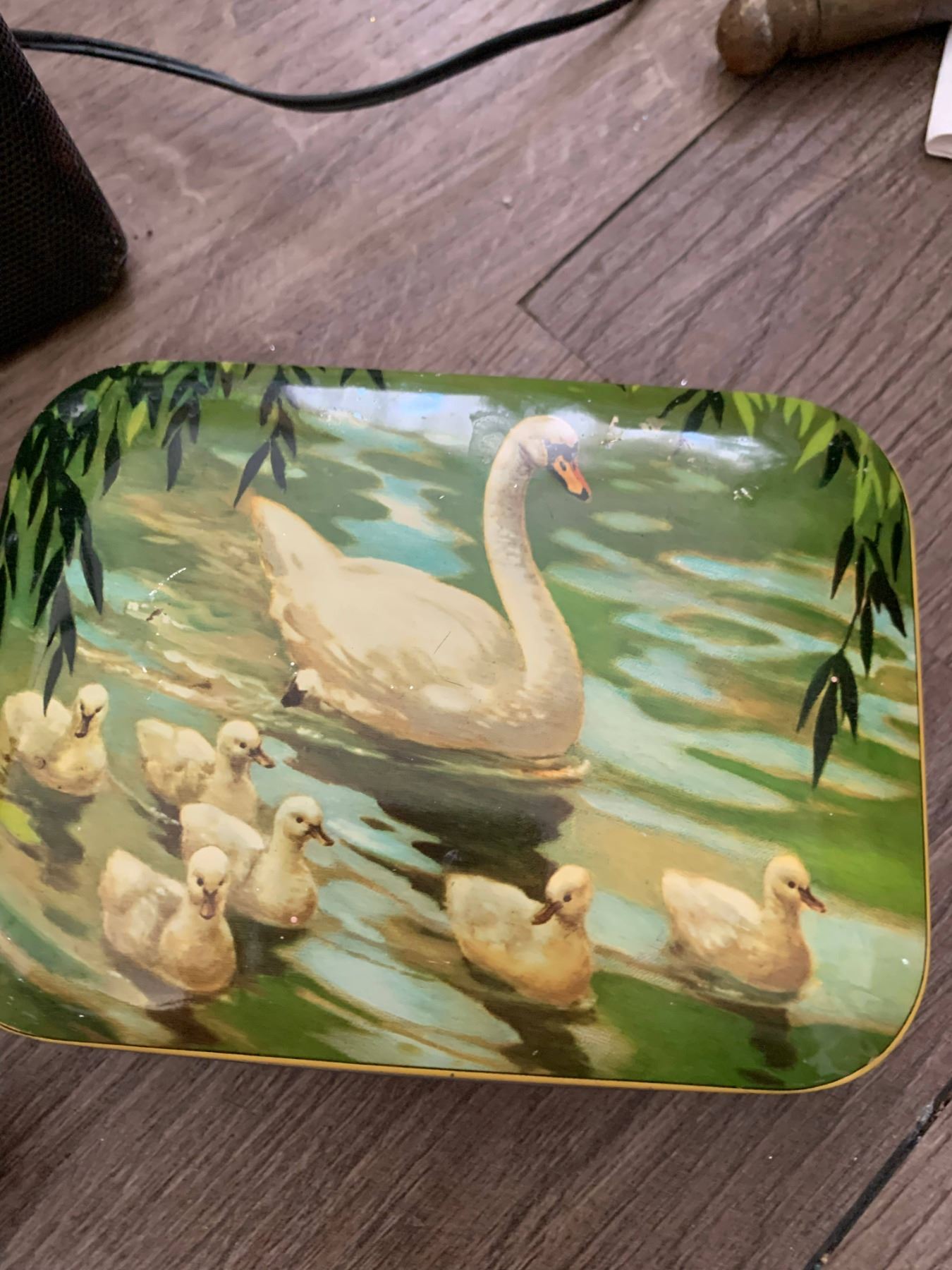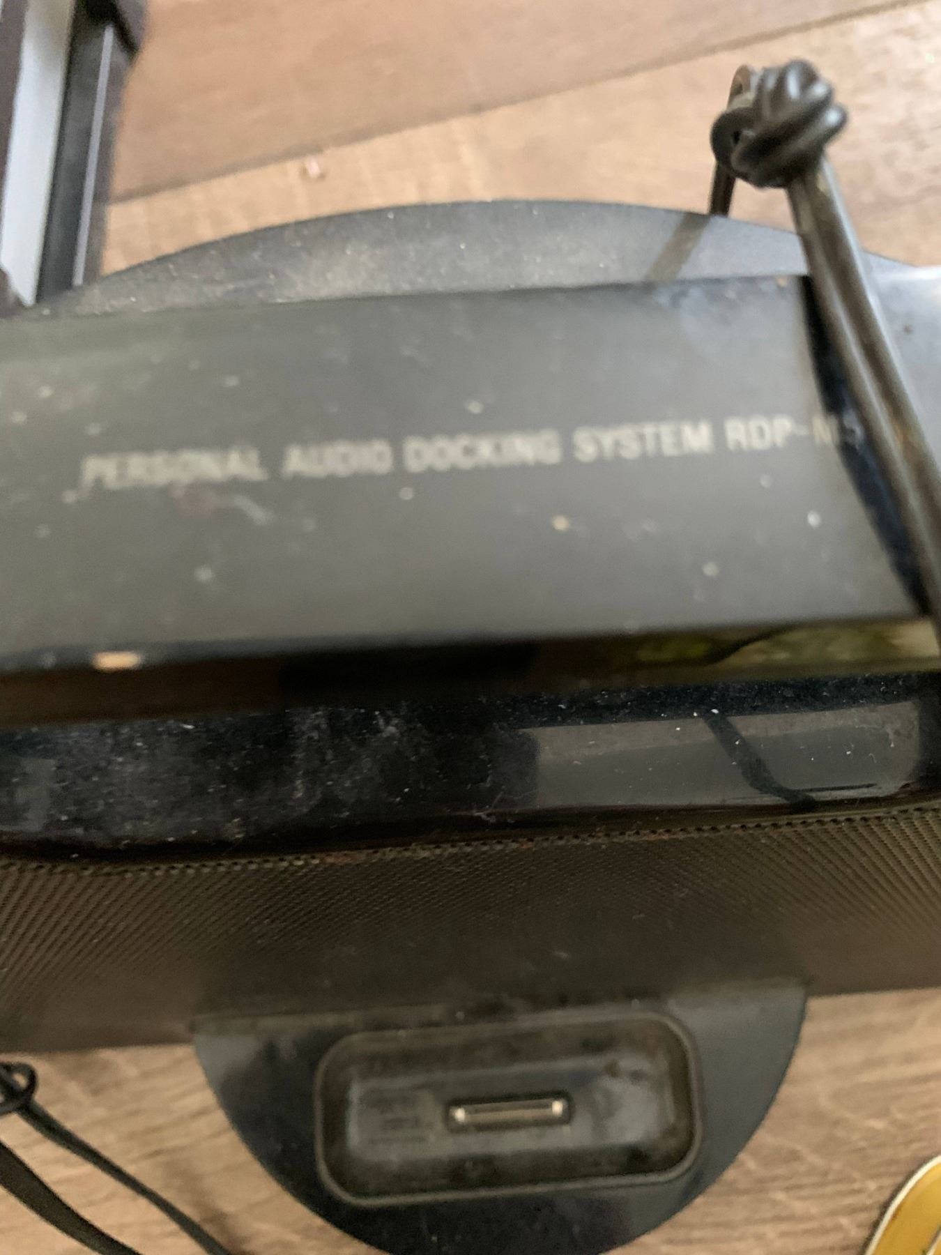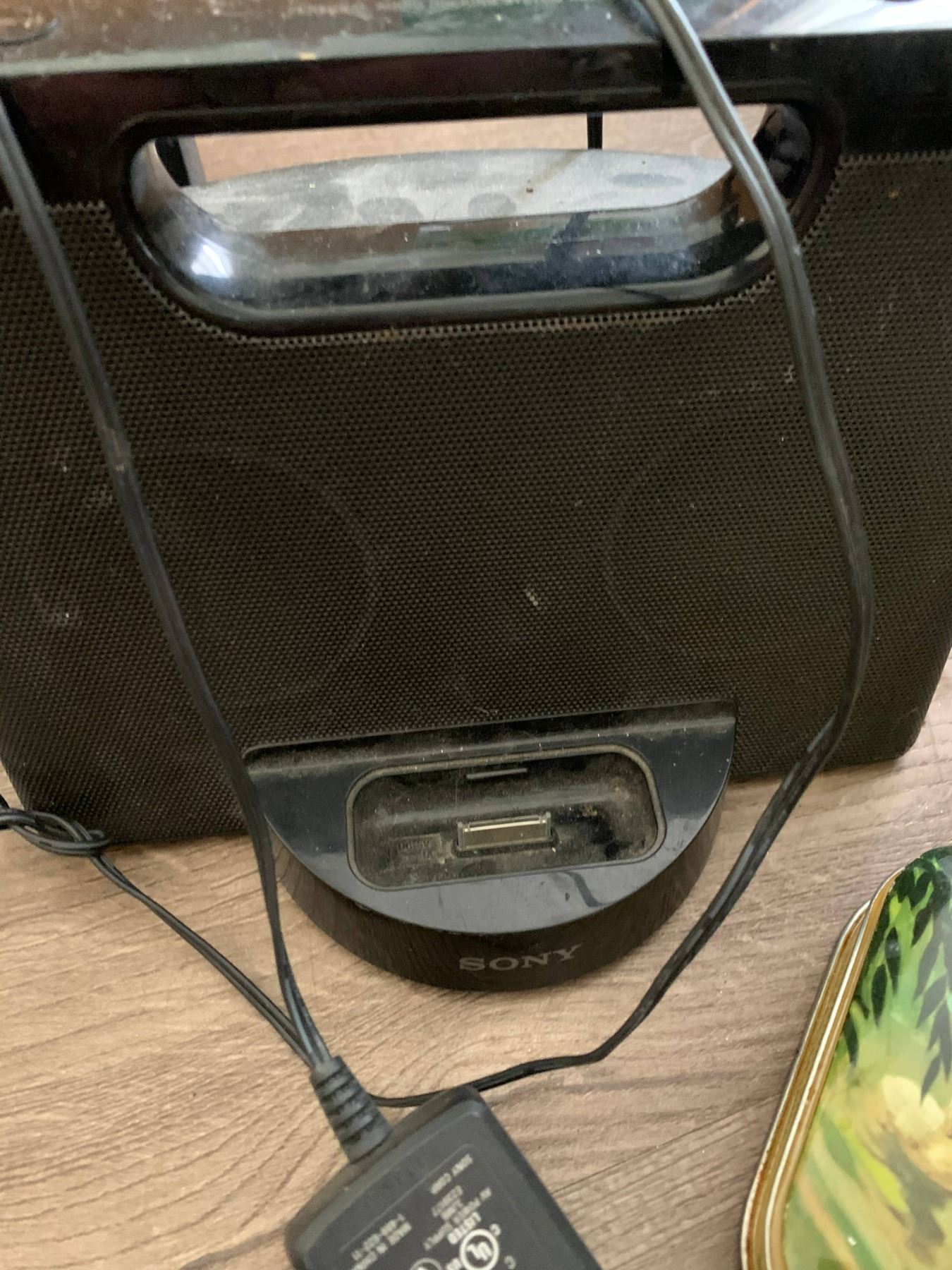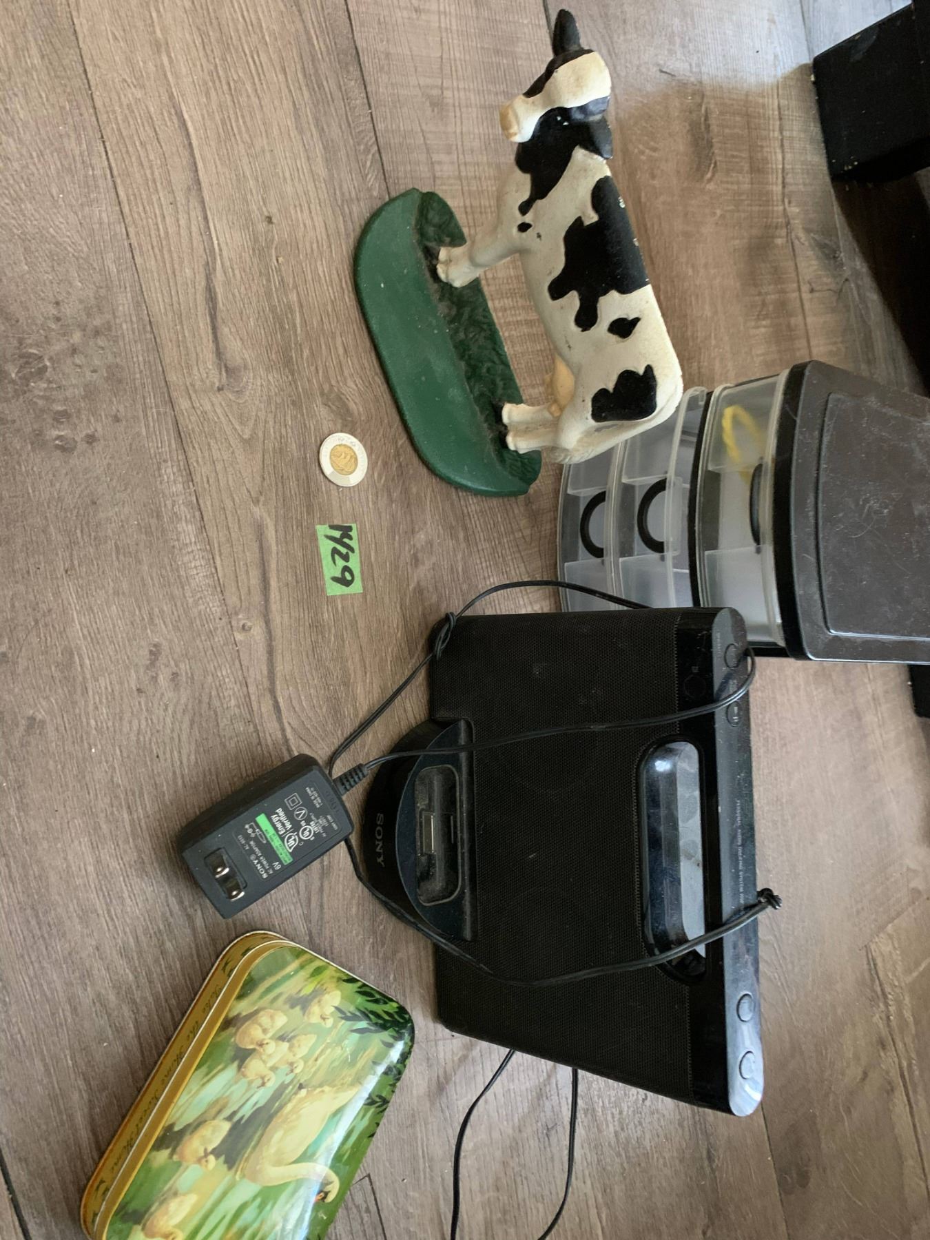 iPod deck works well, cast iron door stop, small collectible tin and three drawer plastic container