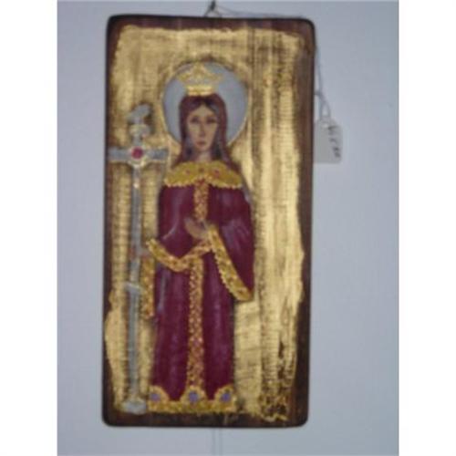 This is a reproduction icon. It is painted on piece of wood, gold and burgundy paint.It was painted by artist from Europe.It is picture of Maria with cross.