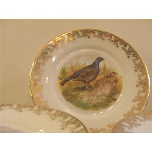 a set of 12 limoges plates game decor , 6 different birds repeted twice , signed Tarnaud & Marbouty Limoges , golden border. excellent condition .