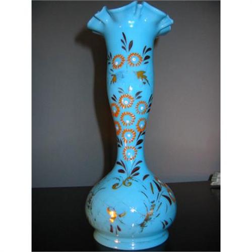 splashes of iridescent gold and floral embellish the surface of this vase.it is hand blown and old. it is hand painted overlay decorated with colors of fall, terra cotta-soft and sharp gold with artsy touch of dots inside the flowers. it is on a beautiful torquoise color glass. it could be fenton but i am not certain. it is just decorative and gorgious with normal wear and tear, for being old, colors are worn some place, but it is so beautiful that is unnoticeable. no crack or chip. very nice piece. measures 10 inches tall and on the bottom about 3.5 inches wide as well as the accordion top has about 4 inches width.