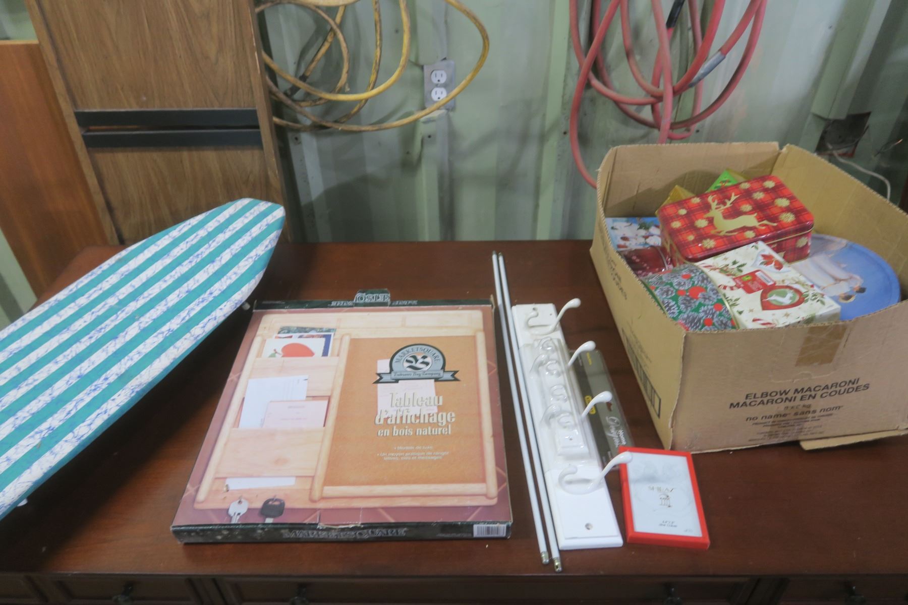 ironing board, bulletin board, tins, etc.