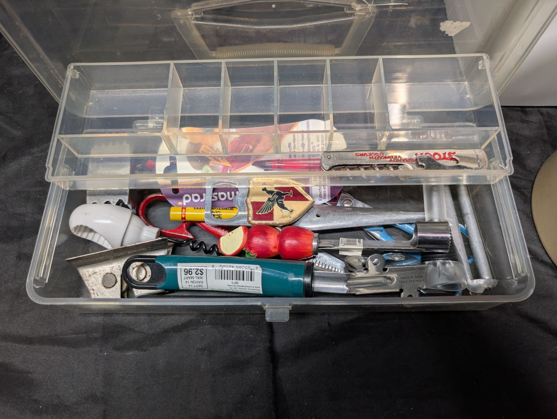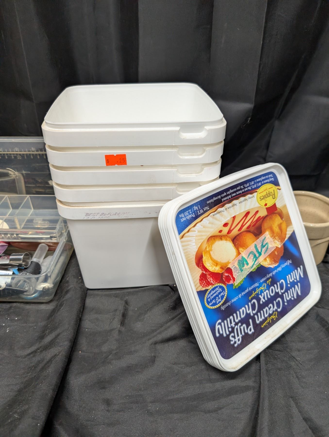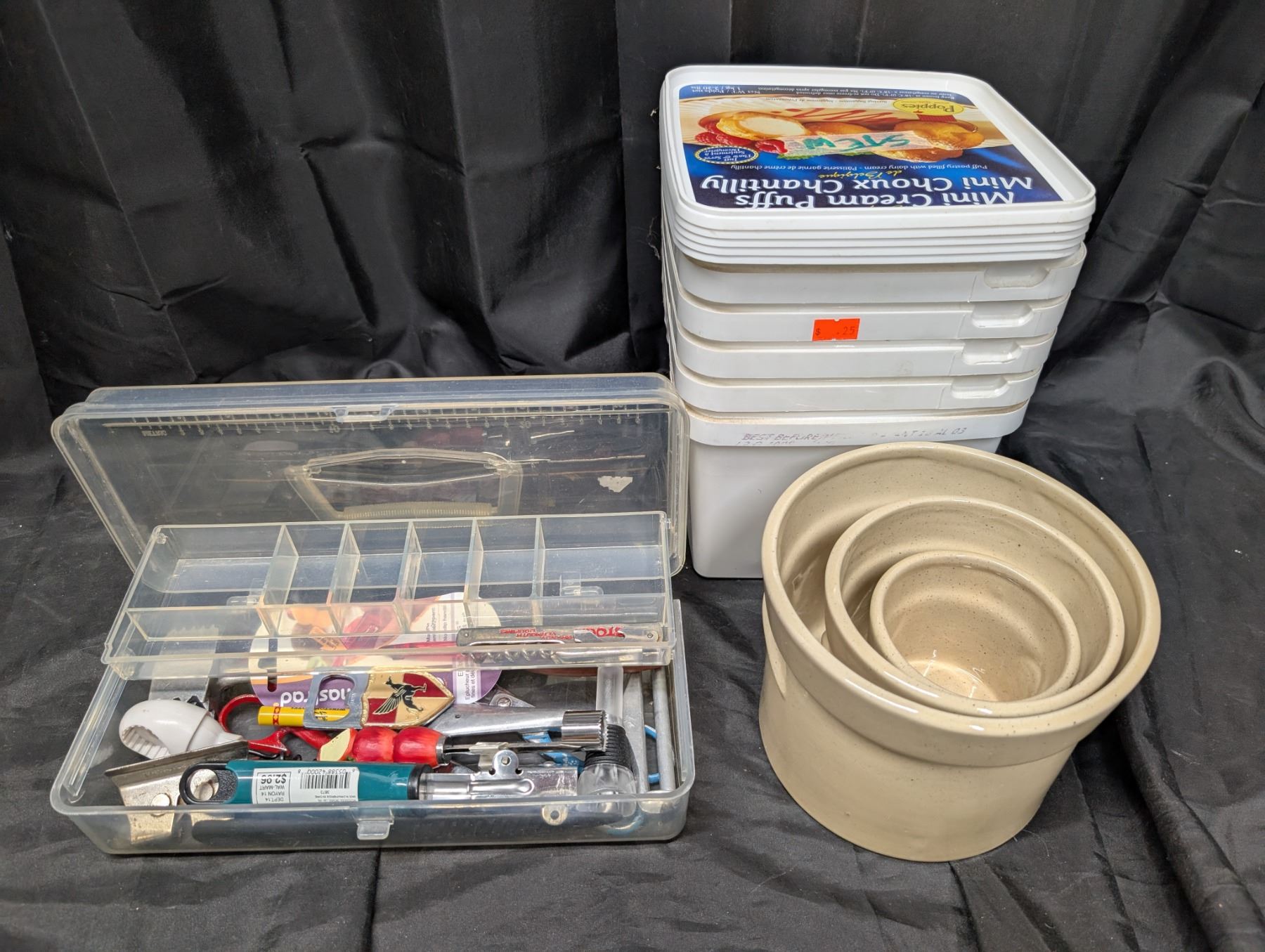 Stoneware Like Jug Holders, Misc. Items, and plastic Tubs
