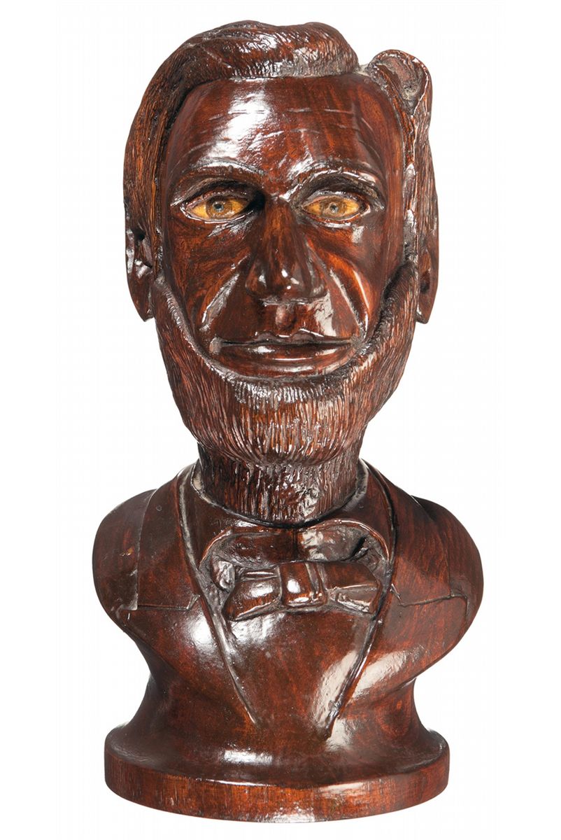 Carved out of wood, this folk art bust of President Abraham Lincoln with mesmerizing eyes measures 11 1/2 inches tall and 6 1/2 inches wide. The bottom of the bust has been punched with the initials "CP".