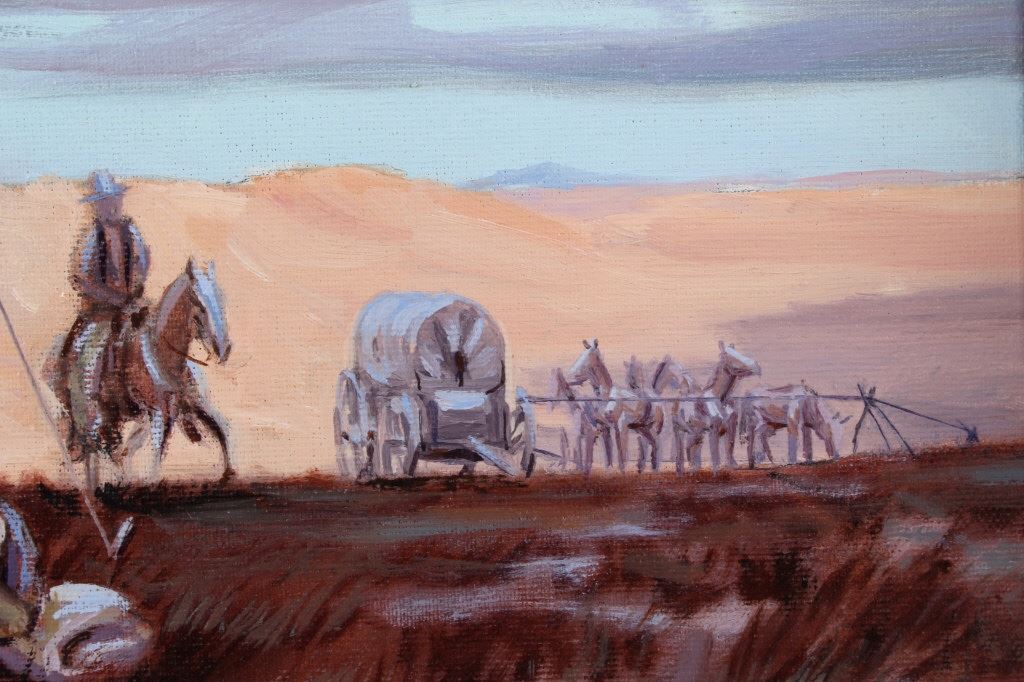 This is an original work of art painting by renowned Montana artist, Fred Fellows. The piece shows a group of Montana Cowboys and Frontiersmen set in the mountain plains setting up their wagons for dinner camp with the sunset behind. Fellows is a Montana artist and is in the "Cowboy Artists of America". Born 1934. Rare Original Art in mid century frame. Frame is 26.25"x32 3/8". Art is 18"x24".