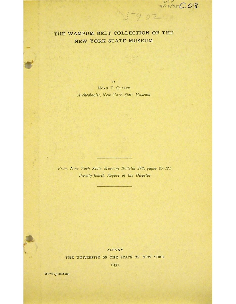 Clarke, Noah T. THE WAMPUM BELT COLLECTION OF THE NEW YORK STATE MUSEUM. Albany: From New York State Museum Bulletin 288, 1931. 8vo, original printed card covers. 85-121, (1) pages, including 7 plates of wampum belts. Holed twice near spine for inclusion in binder; very good. An interesting and well-illustrated monograph on a collection that was the subject of much controversy. The collection and the official role of Wampum Keeper were returned to the Onondaga in 1989.