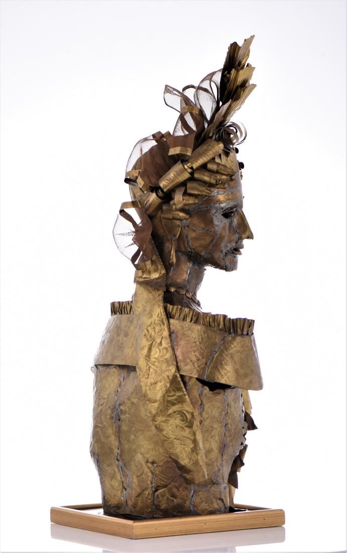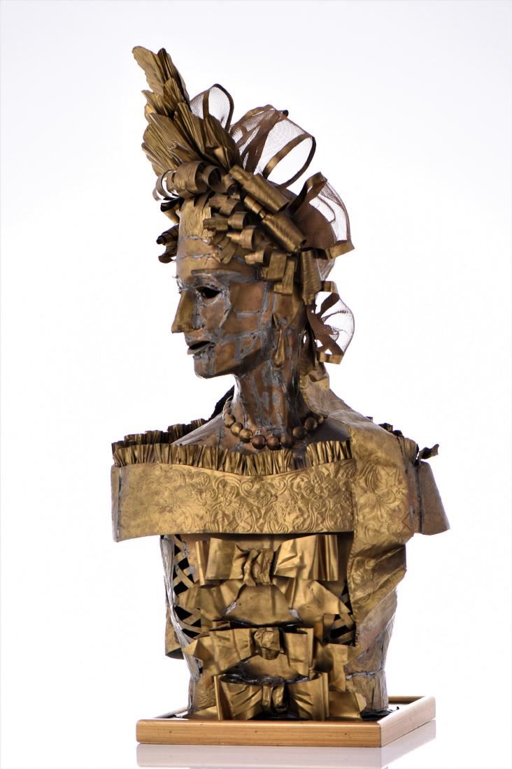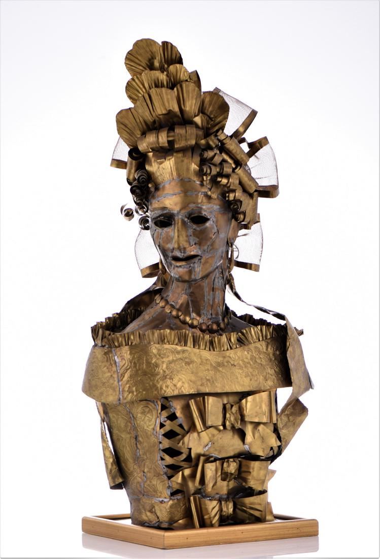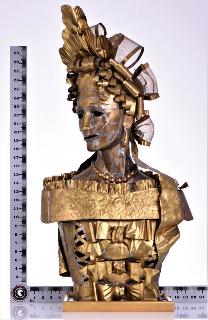 Lee Menichetti, Brass Brutalist Sculpture. Menchetti created in brass sculptures based on Shakespeare's bedazzled characters for a theatrical production as part of his Sculpture Theater of Palm Beach, which he co-founded. His collection of metal sculptures has been shown on numerous occasions to benefit local charities and organizations, and have exhibited at several galleries and museums around the globe. For several years, the nonprofit Sculpture Theater produced a mixture of visual and performing arts with presentations at various Palm Beach-area venues, ranging from museums to theaters; many focused on the literature and folklore of world cultures. Sculpture Theater eventually included multimedia performances for Palm Beach County schoolchildren. Born in New York City, Menichetti, who came to live in Palm Beach in the 1980s, was formerly a noted fashion designer. He studied at the Traphagen School of Fashion in New York. After a career as a dress designer, he became a well-known and award-winning creator of high-fashion accessories, working with such luminaries as Geoffrey Beane and James Galanos. His designs were sold at high-end stores, including Martha's and Sara Frederick's in Palm Beach. For Sculpture Theater, which often combined the visual arts, theater, music and recitations and featured Menichetti's sculptures as highlighted characters who come alive via unseen actors reading their lines. Menichetti created all of the art, costumes and set designs. Estimated less than 50 yrs old. (Pangaea Auctions) Size and/or Weight: See Measurement Photo. (Photos Represent The Lot Condition.)