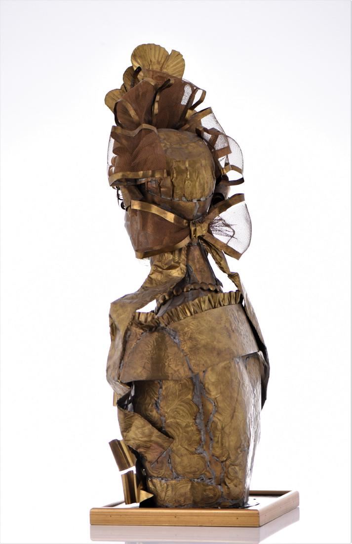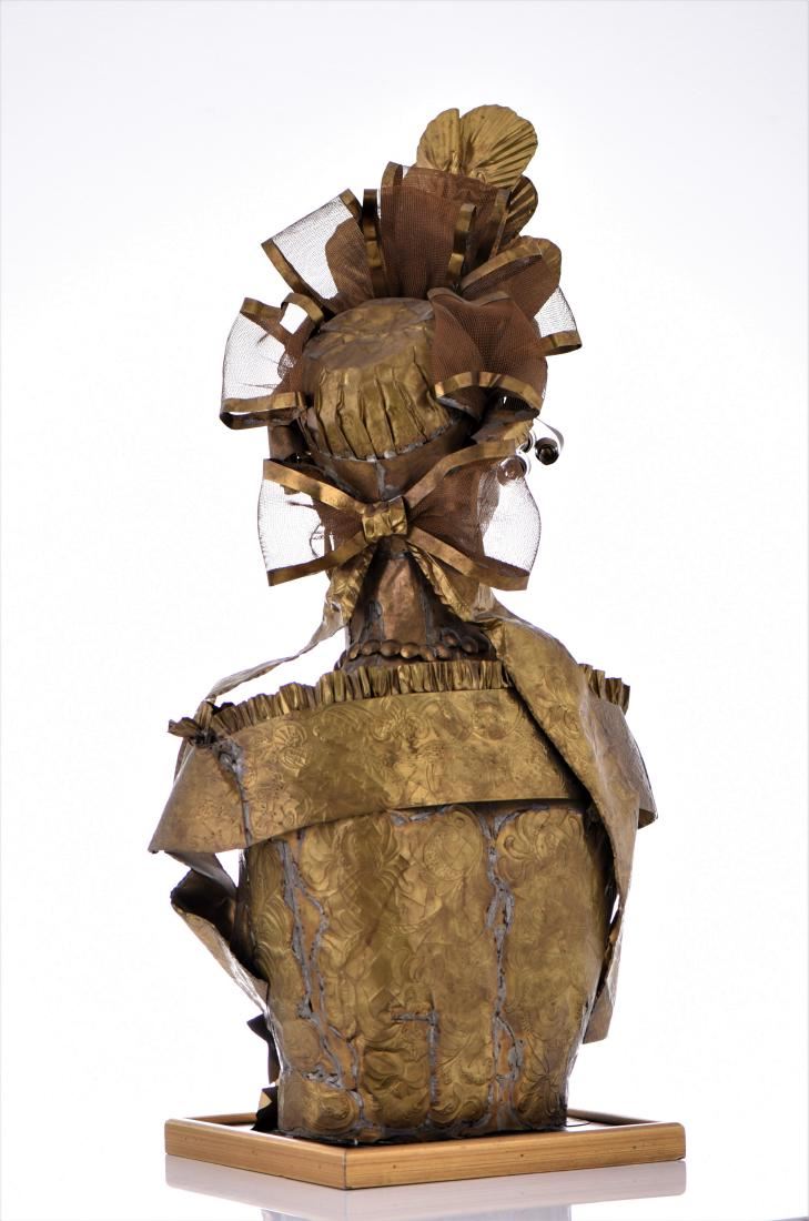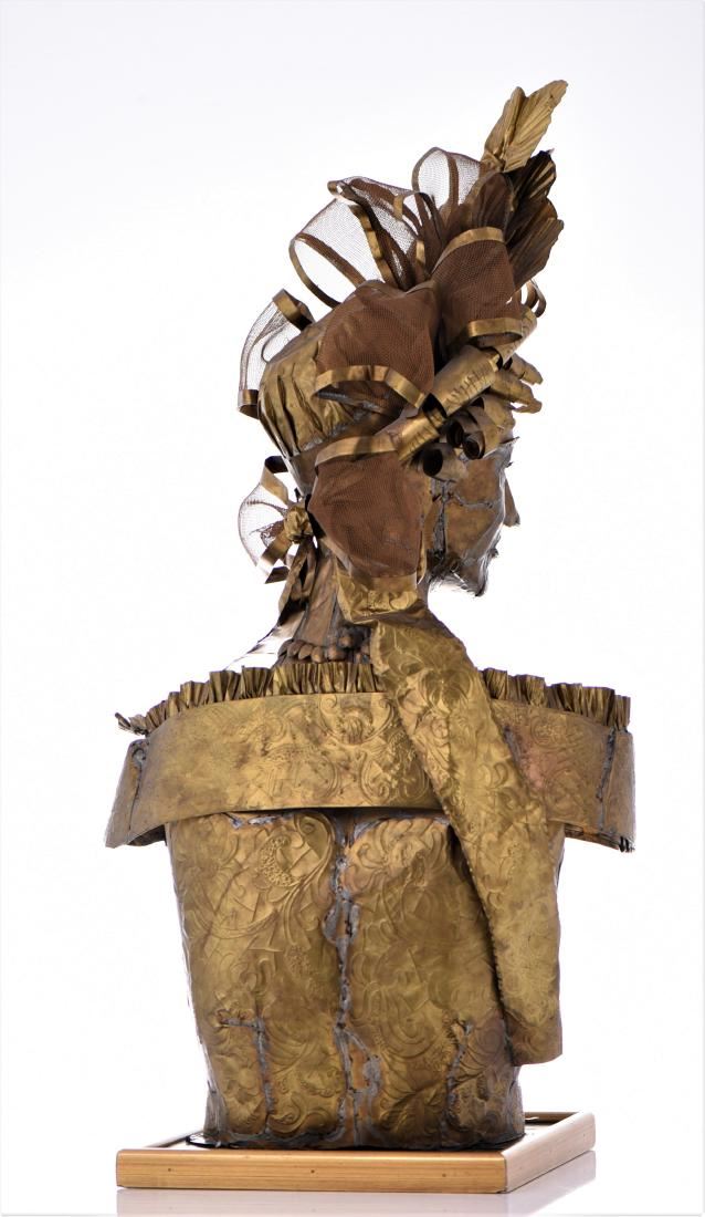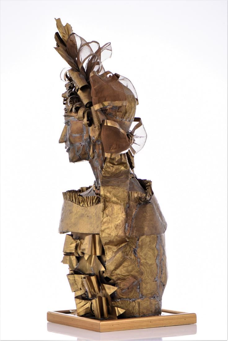 Lee Menichetti, Brass Brutalist Sculpture. Menchetti created in brass sculptures based on Shakespeare's bedazzled characters for a theatrical production as part of his Sculpture Theater of Palm Beach, which he co-founded. His collection of metal sculptures has been shown on numerous occasions to benefit local charities and organizations, and have exhibited at several galleries and museums around the globe. For several years, the nonprofit Sculpture Theater produced a mixture of visual and performing arts with presentations at various Palm Beach-area venues, ranging from museums to theaters; many focused on the literature and folklore of world cultures. Sculpture Theater eventually included multimedia performances for Palm Beach County schoolchildren. Born in New York City, Menichetti, who came to live in Palm Beach in the 1980s, was formerly a noted fashion designer. He studied at the Traphagen School of Fashion in New York. After a career as a dress designer, he became a well-known and award-winning creator of high-fashion accessories, working with such luminaries as Geoffrey Beane and James Galanos. His designs were sold at high-end stores, including Martha's and Sara Frederick's in Palm Beach. For Sculpture Theater, which often combined the visual arts, theater, music and recitations and featured Menichetti's sculptures as highlighted characters who come alive via unseen actors reading their lines. Menichetti created all of the art, costumes and set designs. Estimated less than 50 yrs old. (Pangaea Auctions) Size and/or Weight: See Measurement Photo. (Photos Represent The Lot Condition.)