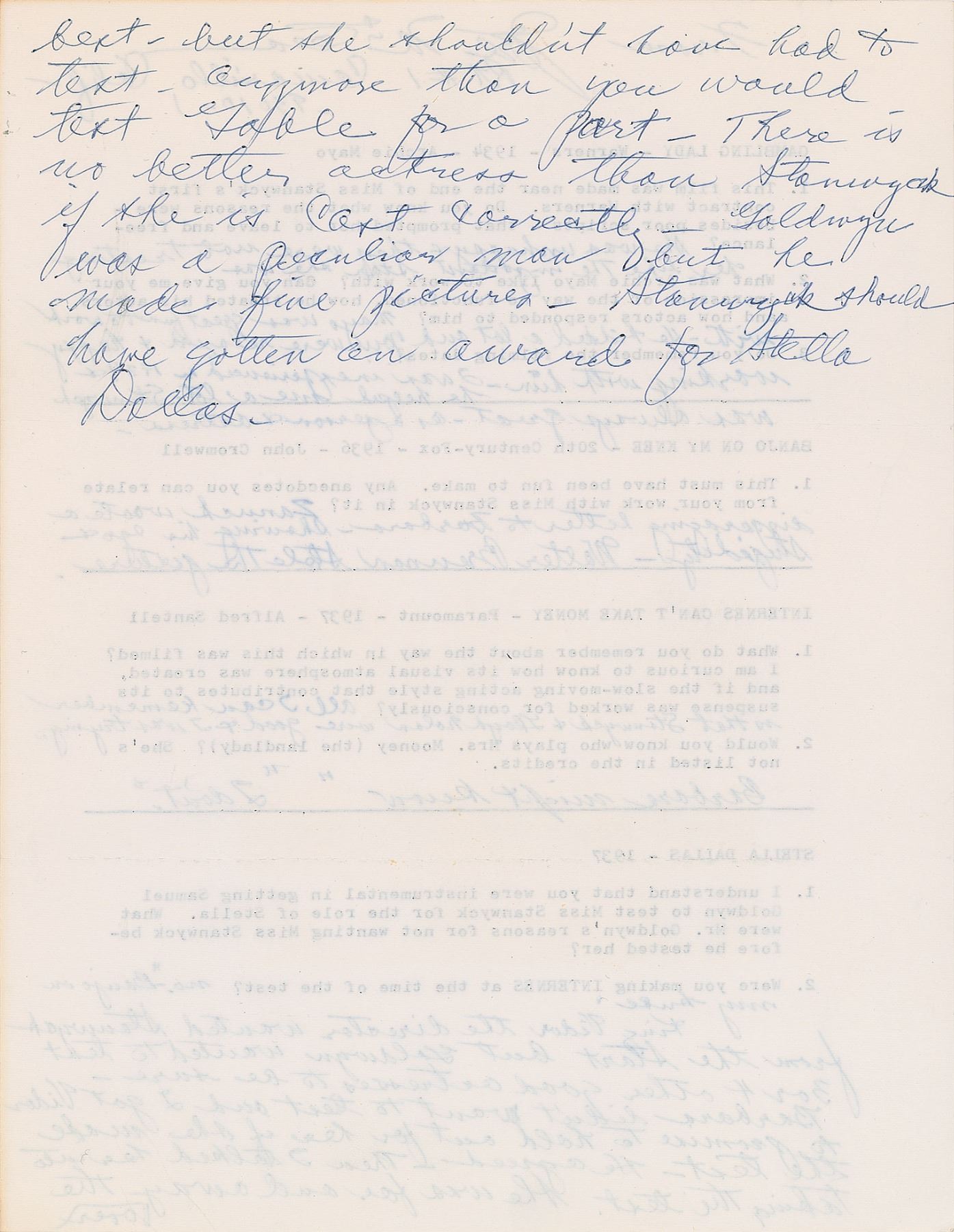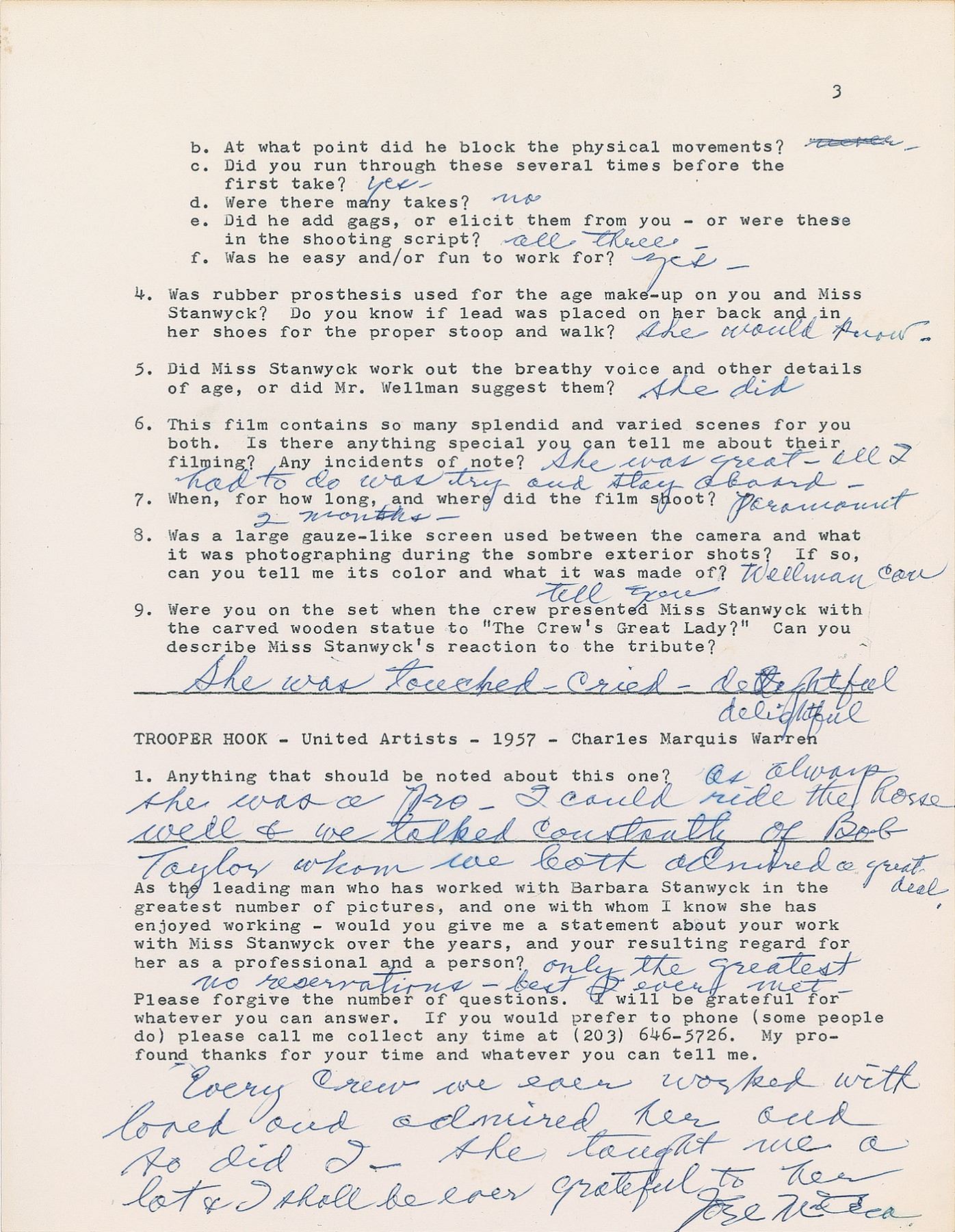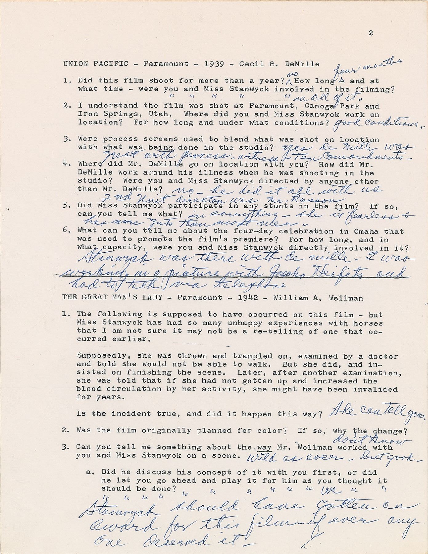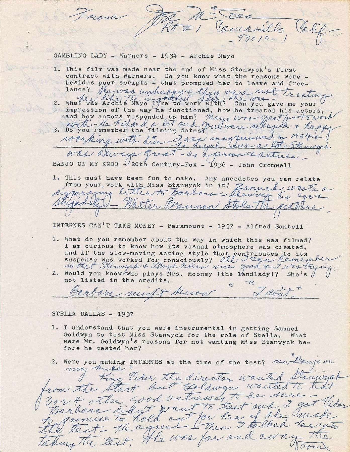 DS, signed “From Joel McCrea, Rt #1, Camarillo, Calif.—93010-1",” three pages, 8.5 x 11, no date, signed again at the conclusion by McCrea. Unusual questionnaire relating to the various films McCrea starred in alongside award-winning actress Barbara Stanwyck, which includes: Gambling Lady, Banjo on My Knee, Internes Can't Take Money, Stella Dallas, Union Pacific, The Great Man's Lady, and Trooper Hook. For the 1936 film Banjo on My Knee, McCrea notes that "Zanuck wrote a disparaging letter to Barbara—showing his ego & stupidity—Walter Brennan stole the gesture." When later asked if he had anything to do with Stanwyck's test for 1937's Stella Dallas, McCrea affirms that "King Vidor the director wanted Stanwyck from the start but Goldwyn wanted to test 3 or 4 other good actresses to be sure…She was far and away the best, but she shouldn't have had to test—anymore than you would test Gable for a part. There is no better actress." McCrea details his location for the premiere of 1939's Union Pacific: "Stanwyck was there with de Mille. I was working in a picture with Jascha Heifetz and had to talk via telephone." His final statement concerning his work with Stanwyck: "Only the greatest, no reservations—best I ever met—Every crew we ever worked with loved and admired her and so did I. She taught me a lot & I shall be ever grateful to her." In fine condition.