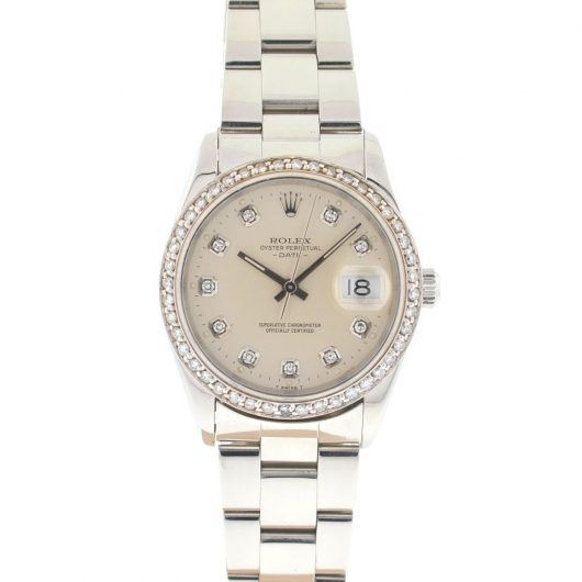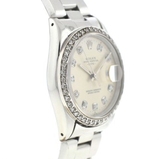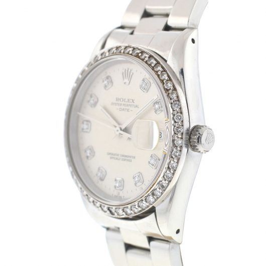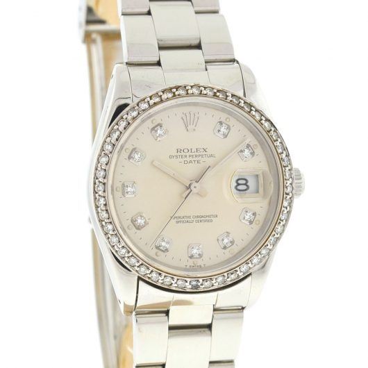Style: Rolex 15200 Date 34mm Stainless Steel Diamond Dial & Bezel Automatic Watch