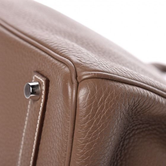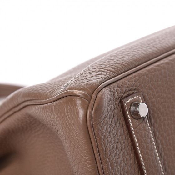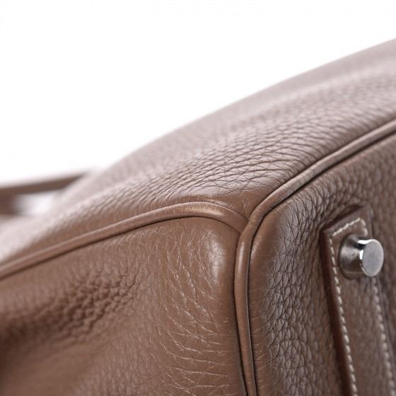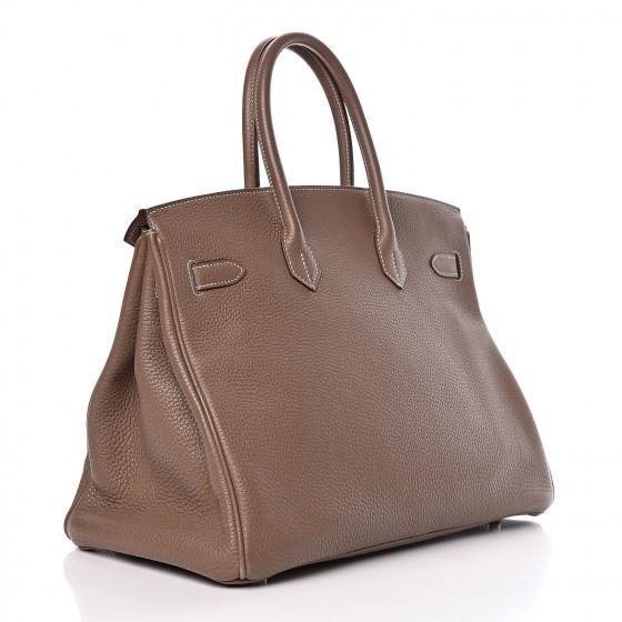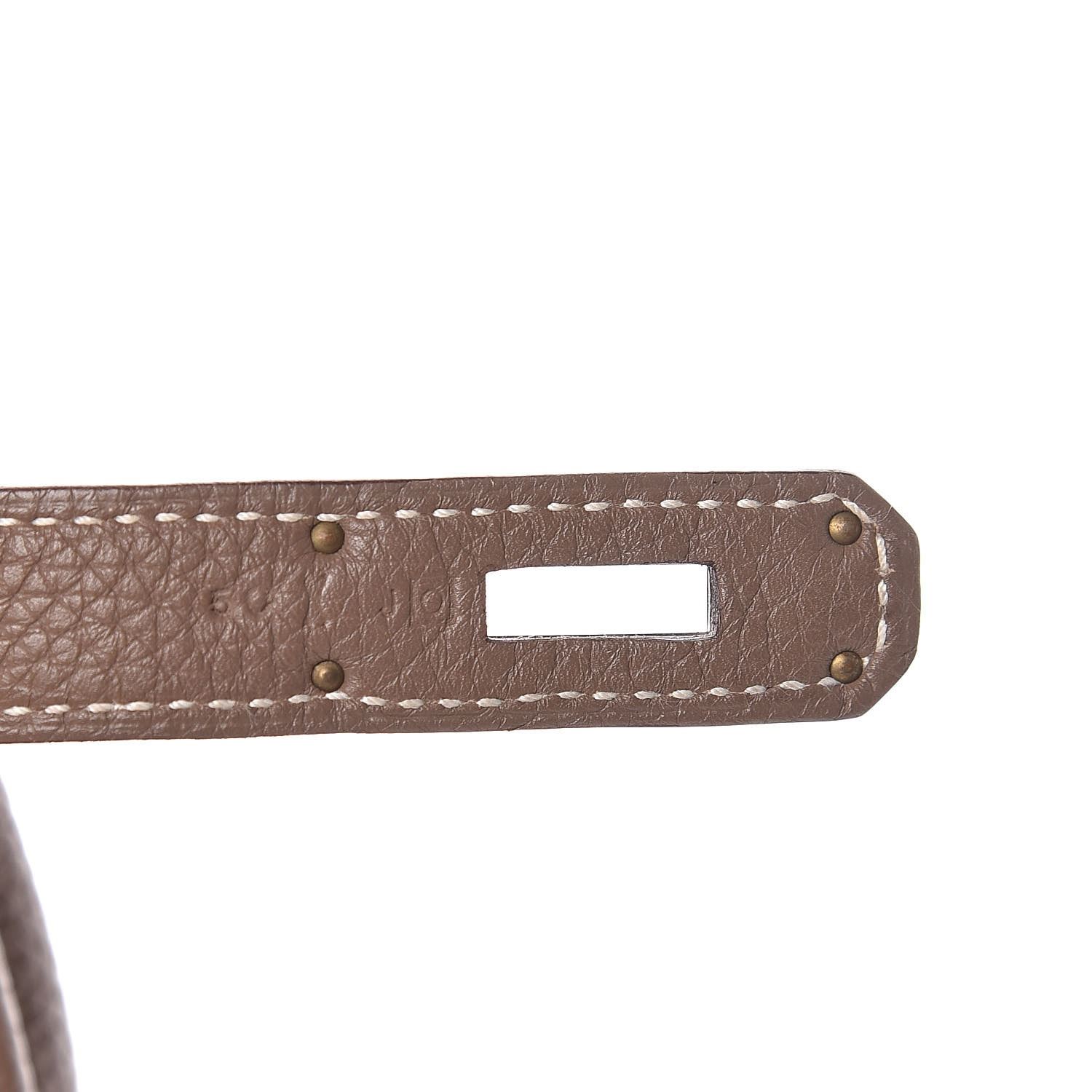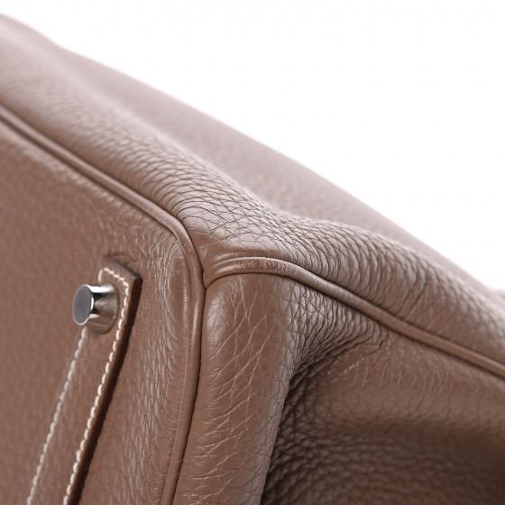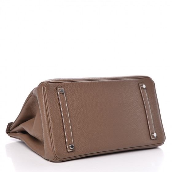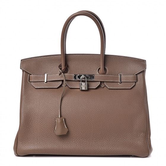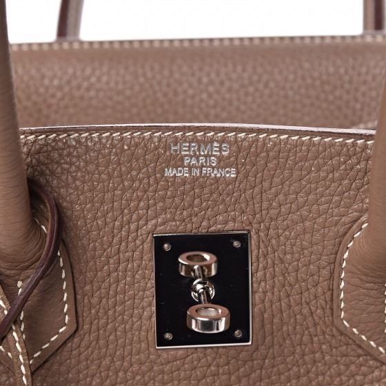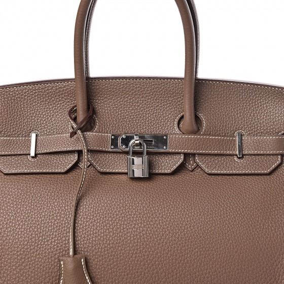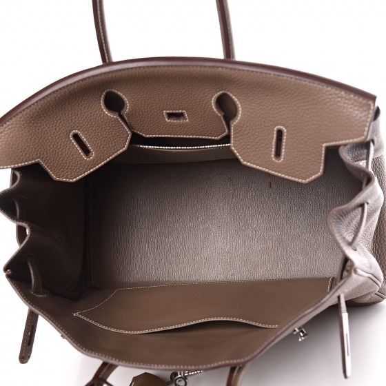 Description: Etoupe handbag is handcrafted of luxurious Taurillon Clemence calfskin leather in gray. The bag features rolled leather top handles, a frontal flap with a strap closure and gold tone hardware including a padlock and leather covered keys on a clochette. The top flap opens to a matte chevre goatskin leather interior with zipper and patch pockets.
