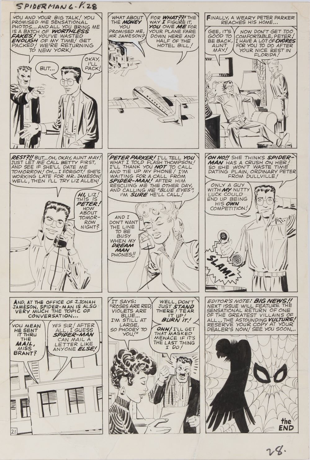 16. Steve Ditko original artwork for The Amazing Spider-Man #6 Page 21. (Marvel 1963) Accomplished in pencil and ink on 13.75 x 20.25 in. large comic art stock. From the very dawn of the Silver-Age of Marvel Comics comes this historic page from Amazing Spider-Man #6. We can't even count how many times this very issue has been reprinted, being one of the most well-remembered of the first few issues of Spider-Man ever. It's hard enough to find original Steve Ditko art from Amazing Spider-Man, but from one of the first few issues? Near impossible. Here is an extremely rare opportunity to do just that. This was a period of time when co-creators Stan Lee and Steve Ditko were still first developing Spidey' and building a gallery of supporting characters and villains for him to fight (this very issue introduces "The Lizard'). It should be noted that this specific page actually shows the second appearance of "The Vulture" in an ominous shadowy cameo in the last page end panel (as seen here with a backdrop of a "Spider-Man" web-face!). Great images also of "J. Jonah Jameson" (in classic character as his usual "jolly self" with both "Peter" and "Betty Brant"), "Liz Allen" (being rude to Peter and of course mentioning "Flash Thompson"), and even dear old "Aunt May"! A great example of early Marvel history. With extensive sensitive restoration done to the page including tear repairs and seals, 3-word balloon stats replaced, and re-affixing pieces to a backing board of comic art stock. Presents in good condition* $20,000 - $30,000