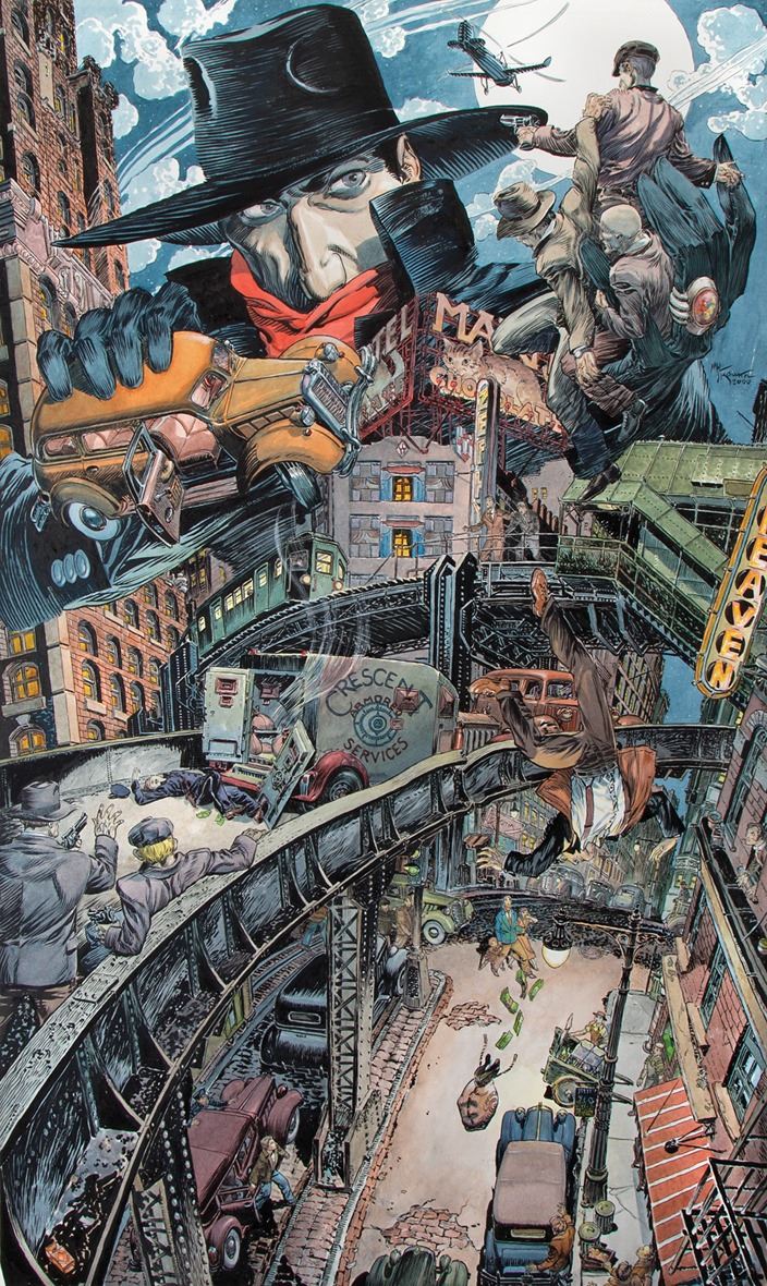 42. Michael Kaluta monumental original painting "The Shadow Knows". (2000) Accomplished in ink and watercolor on 38.5 x 52.25 in. art board. This tremendous piece is likely the largest finished work of the famous character ever created. It was commissioned by a patron of the arts, and Kaluta spent countless hours creating the imposing work. It depicts a scene of many layers and depth with no less than 35 characters illustrated, and imagery of a bank robbery, death, police, vintage cars, elevated trains, New York City tenements and much, much, more - all putty in the hands of "The Shadow". A major and important work. Signed in the middle right of art, "M W Kaluta 2000". Exhibiting some mounting remnants and cleanly drilled holes around the perimeter of the board in blank borders from previous framing, not affecting art. In fine condition. $10,000 - $20,000
