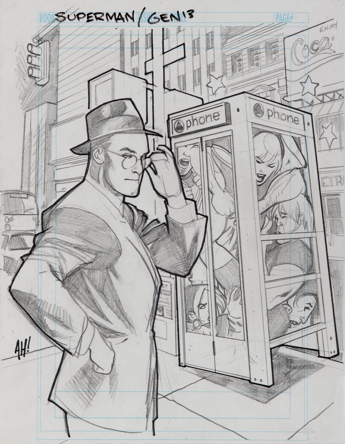 142. Adam Hughes original "Superman"/"Gen 13" artwork (publication unknown). (DC/Wildstorm, 2000) Accomplished in pencil on 8.5 x 11 in. artist's leaf. Adam Hughes is well known for his stunning covers and artwork. Assumed published but use unknown. In this humorous piece we see his take on "Clark Kent's" dilemma of looking for a phone booth to change into "Superman, only to find the "Gen 13" kids playing the classic college game of stuffing a group of people tightly into the confined space. A really beautiful, tightly detailed finished pencil work by Hughes. In fine condition. $500 - $700