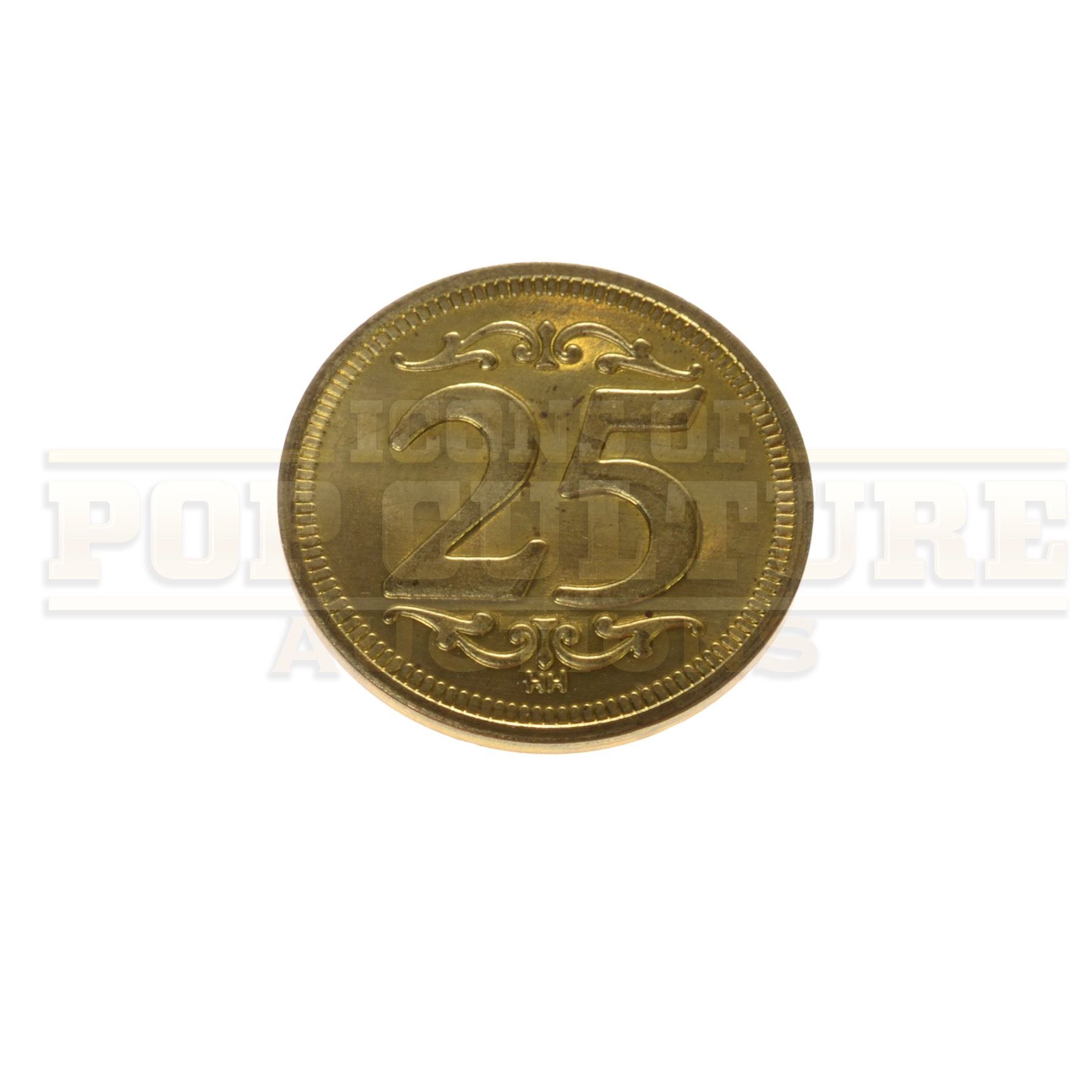 This original 25 cent prop coin was custom-made for use in Ron Howard’s How the Grinch Stole Christmas (2000). Crafted from metal and measuring 1" in diameter, the coin features a whimsical design unique to the fictional town of Whoville. One side displays a holiday wreath with bells beneath the phrase “E Pluribus Whonum,” while the reverse is engraved with an ornate “25.”