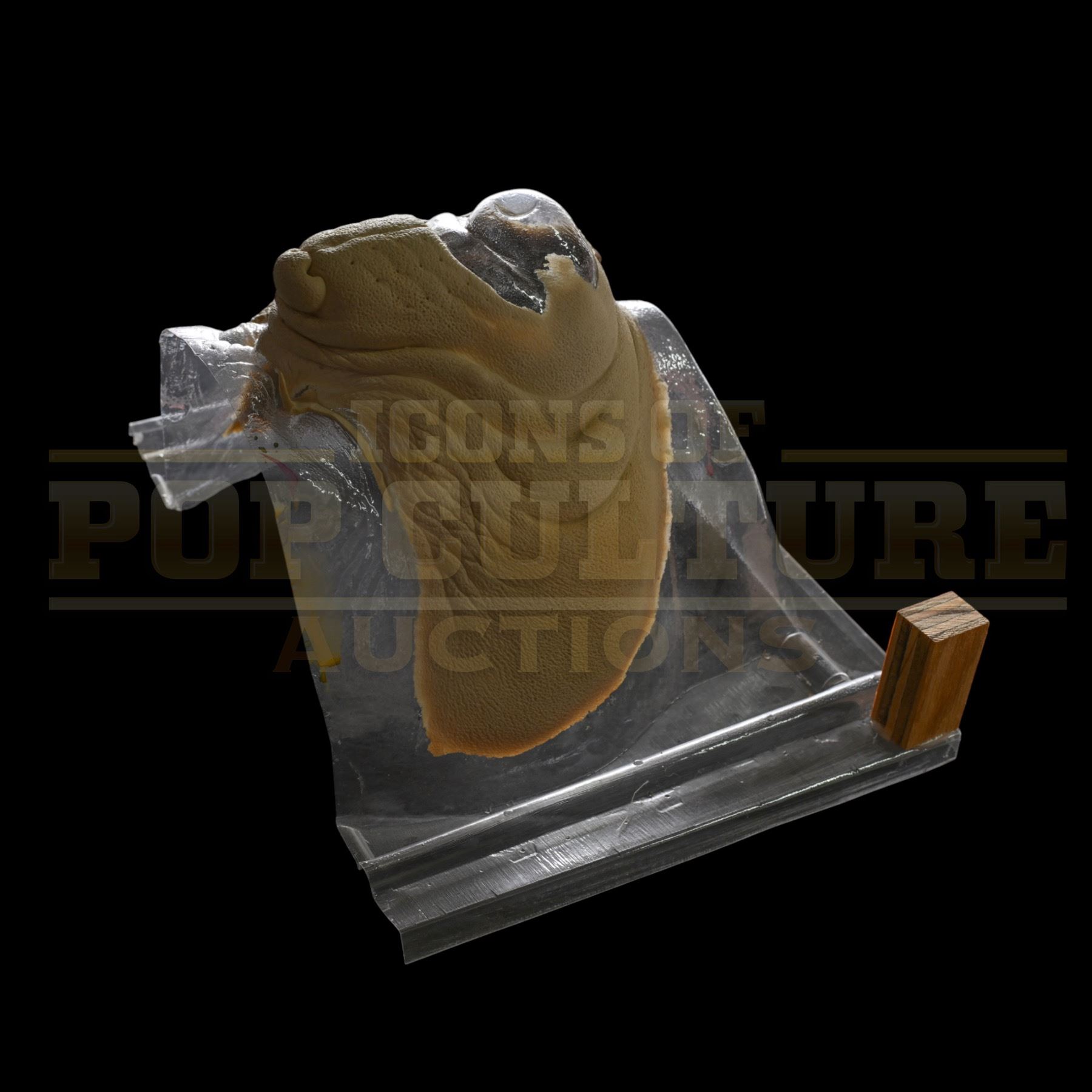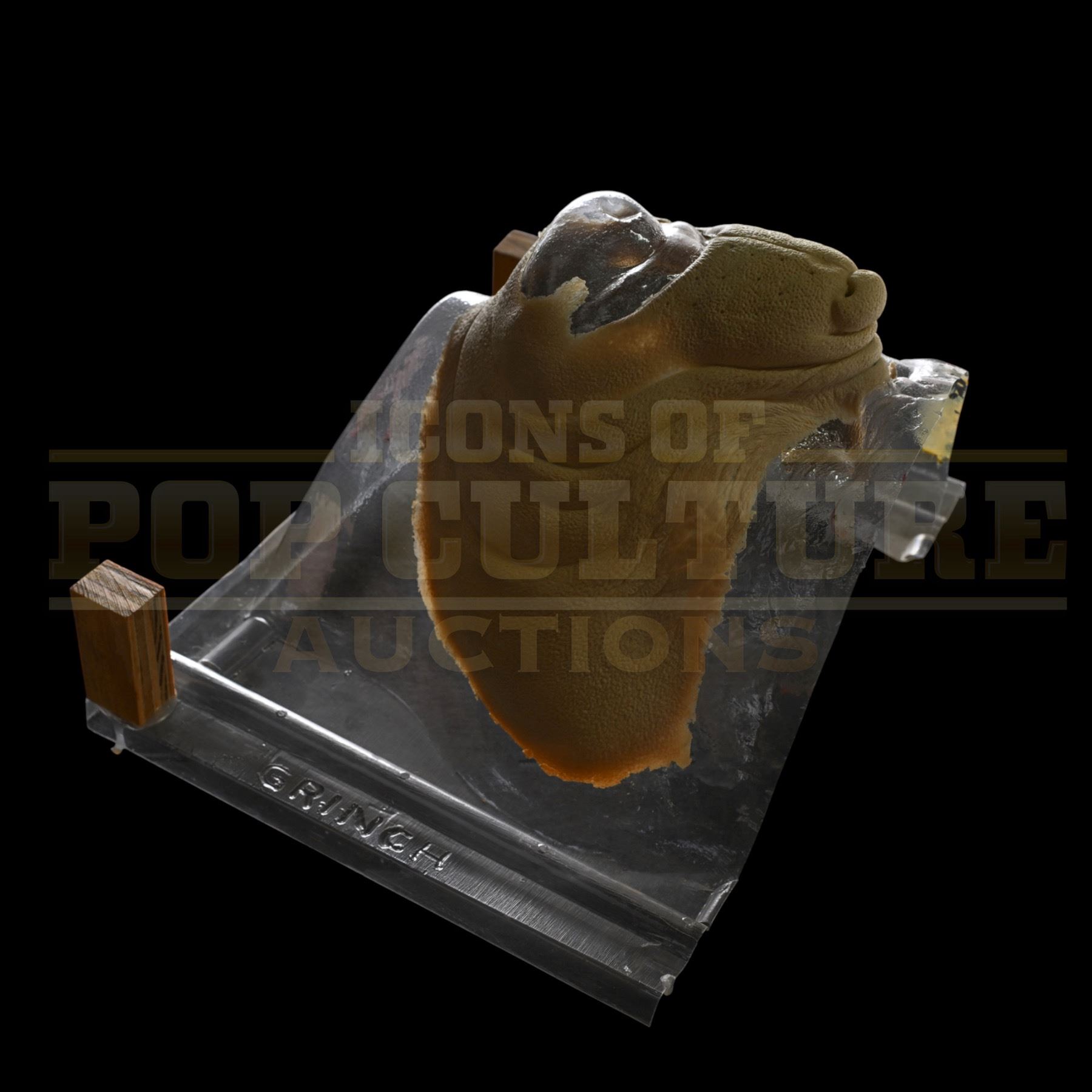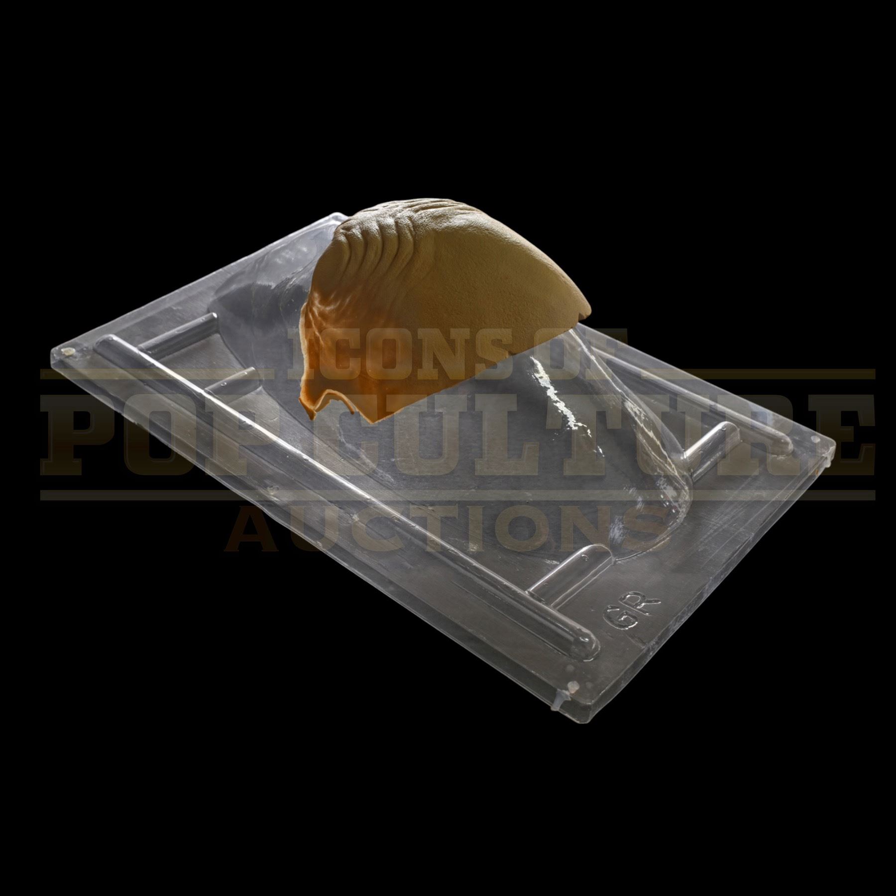 These extraordinary production pieces consist of the Grinch’s signature foam latex muzzle and forehead, both expertly crafted and resting on clear plastic life casts of Jim Carrey’s face and head. The molds are marked “GRINCH” and “GR”, serving as direct production identifiers from Baker’s Cinovation Studios. Each appliance captures the detailed wrinkles, folds, and exaggerated features that defined Carrey’s expressive transformation into Dr. Seuss’s iconic misanthrope.
