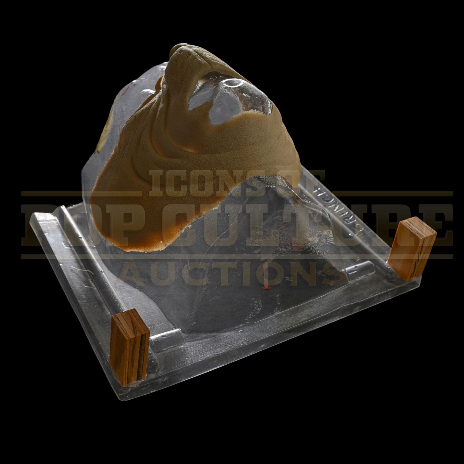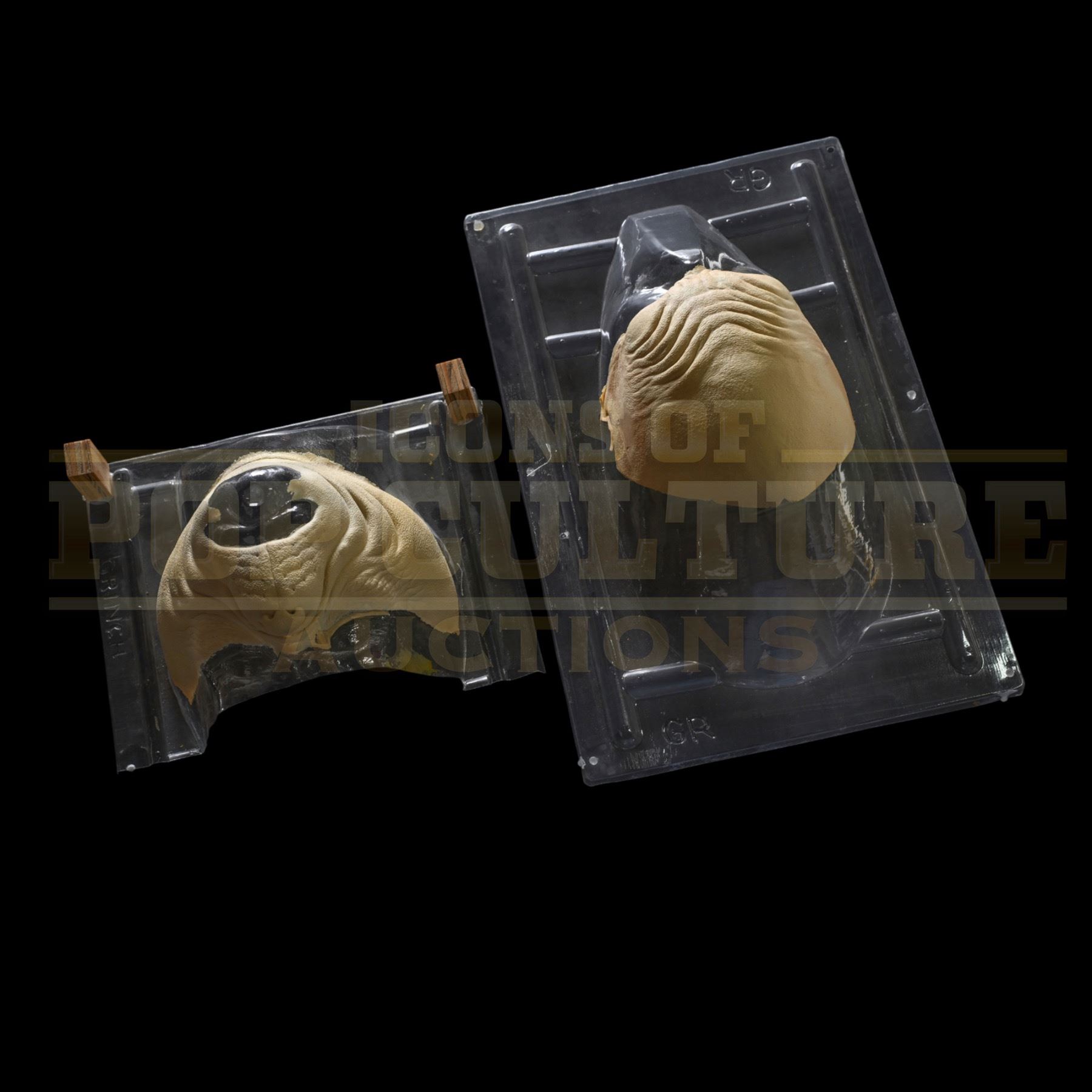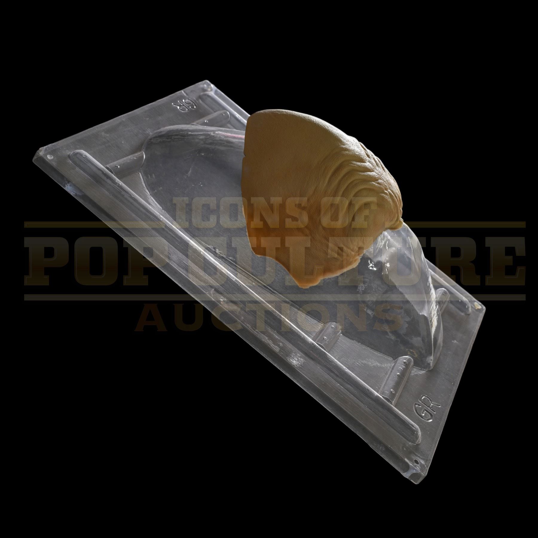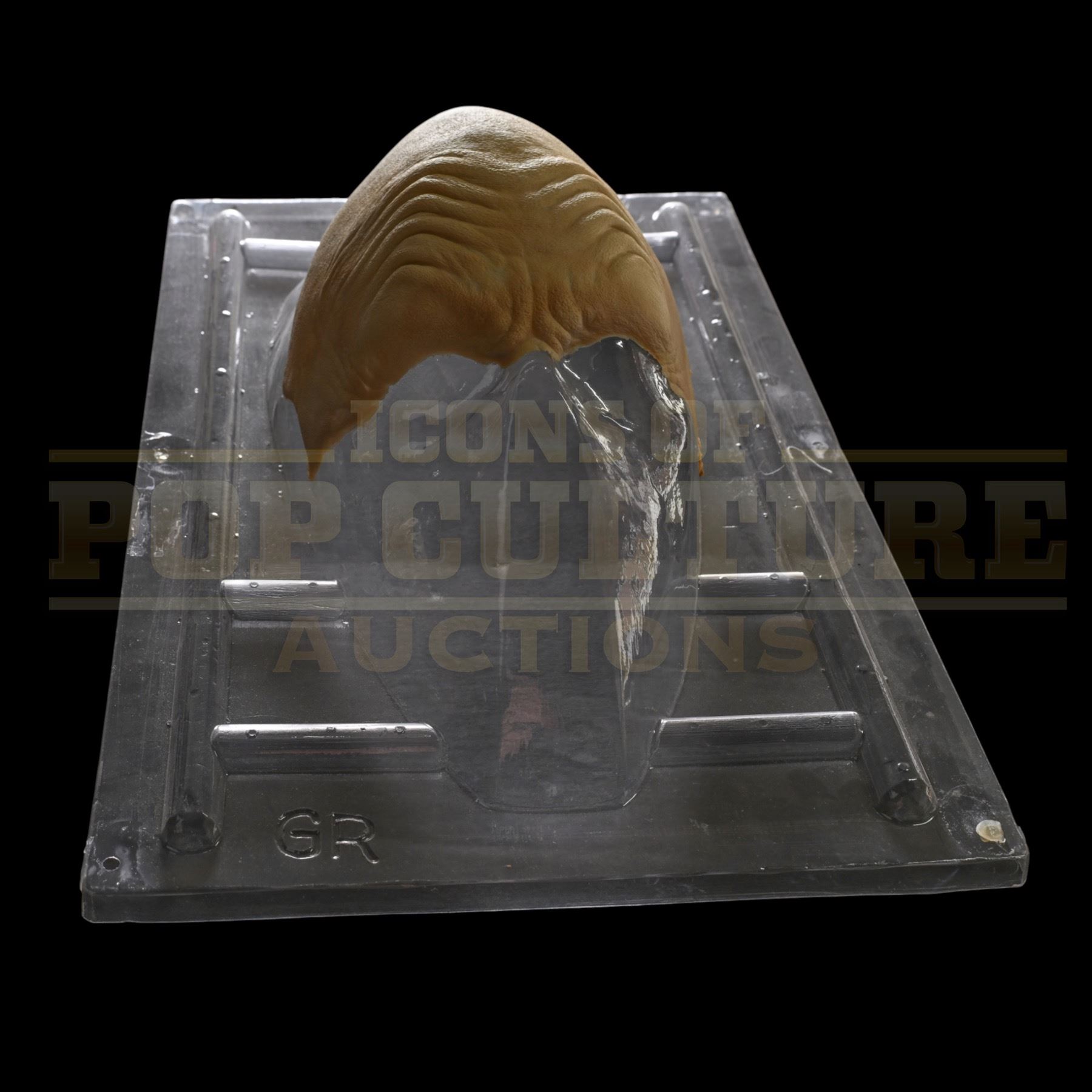 These extraordinary production pieces consist of the Grinch’s signature foam latex muzzle and forehead, both expertly crafted and resting on clear plastic life casts of Jim Carrey’s face and head. The molds are marked “GRINCH” and “GR”, serving as direct production identifiers from Baker’s Cinovation Studios. Each appliance captures the detailed wrinkles, folds, and exaggerated features that defined Carrey’s expressive transformation into Dr. Seuss’s iconic misanthrope.