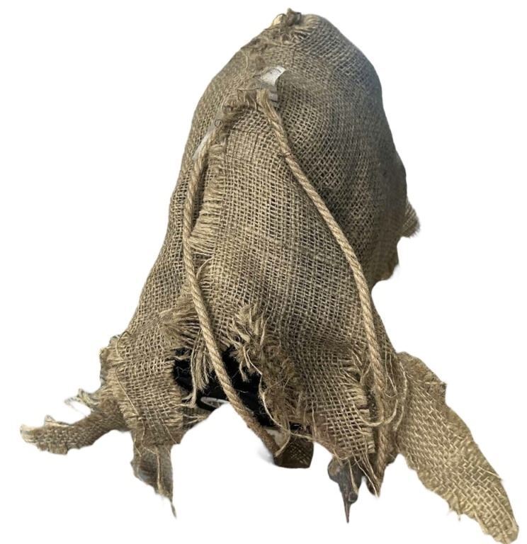 This mask features a burlap-covered Ghostface-shaped mask attached to a brown burlap hood. The back of the hood features an open seam and white strips of self-fasteners. It also features two twine ties. The eyes were modified with dark mesh fabric.