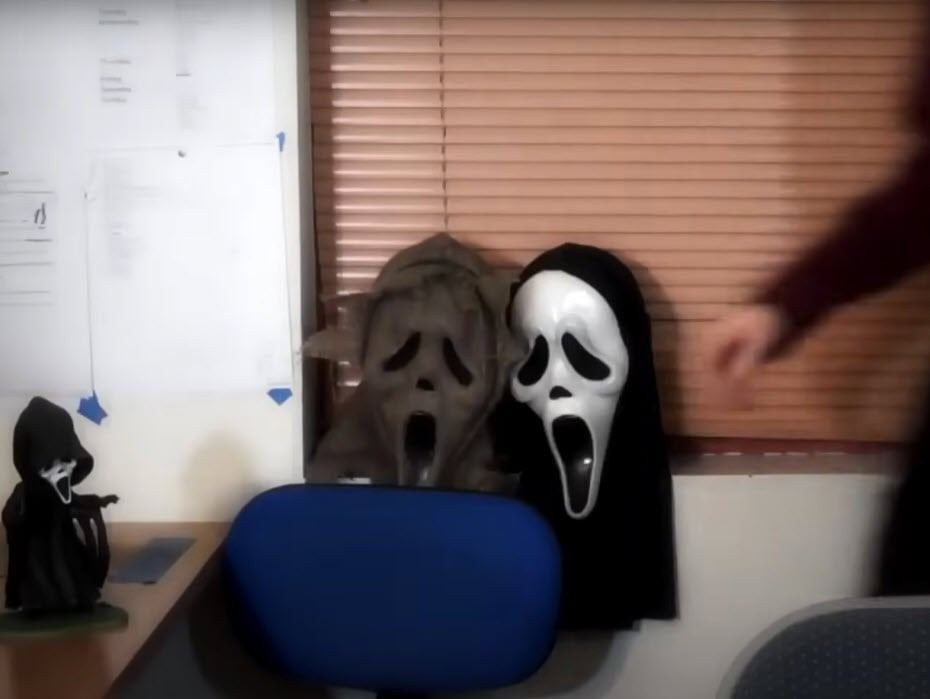 Joshua Dudley and Rachel Arnold hosted auditions to replace Audrey Marquee and her roommate after they were murdered and decorated their audition space with ghostface masks, including a scarecrow and a traditional black-and-white ghostface mask on the window sill.