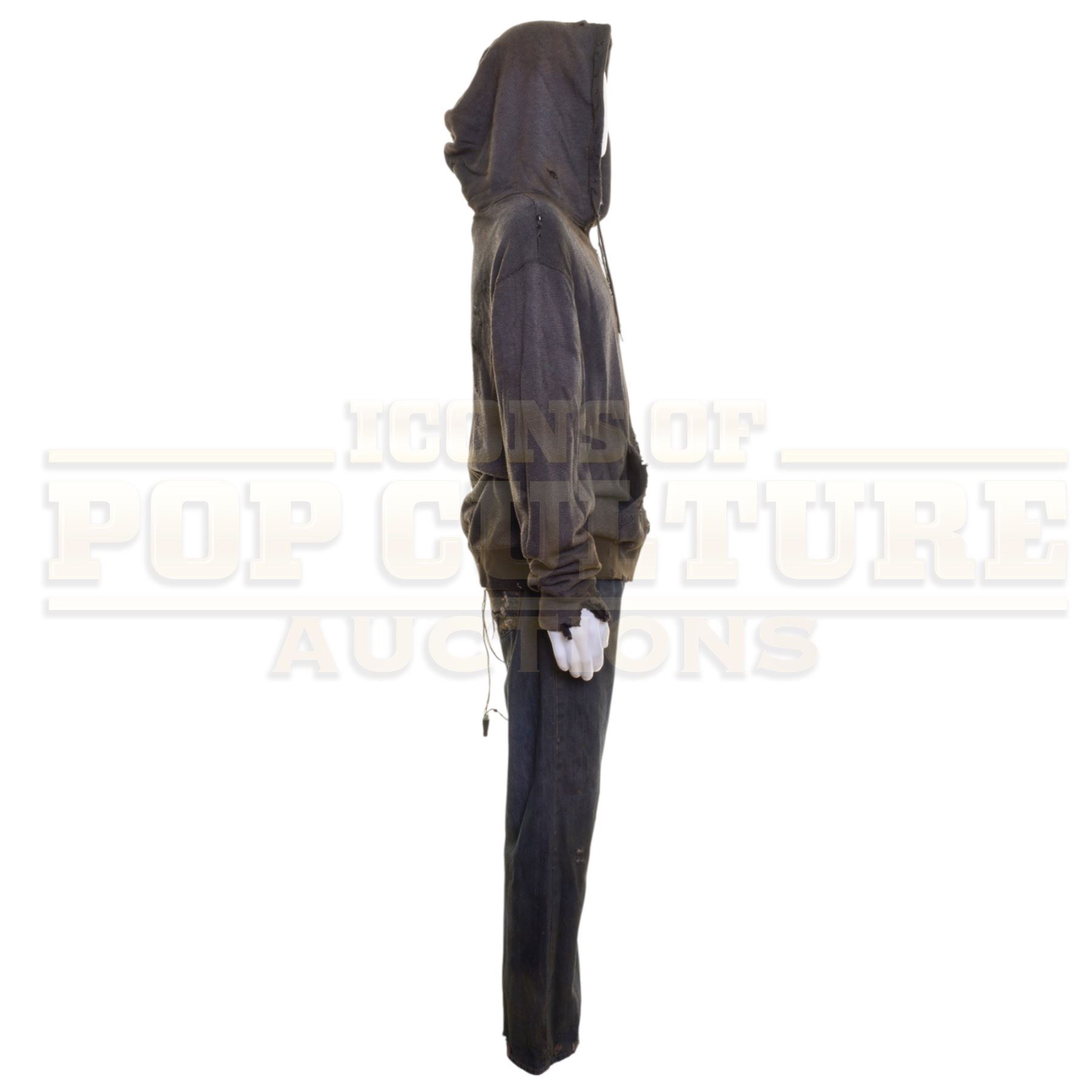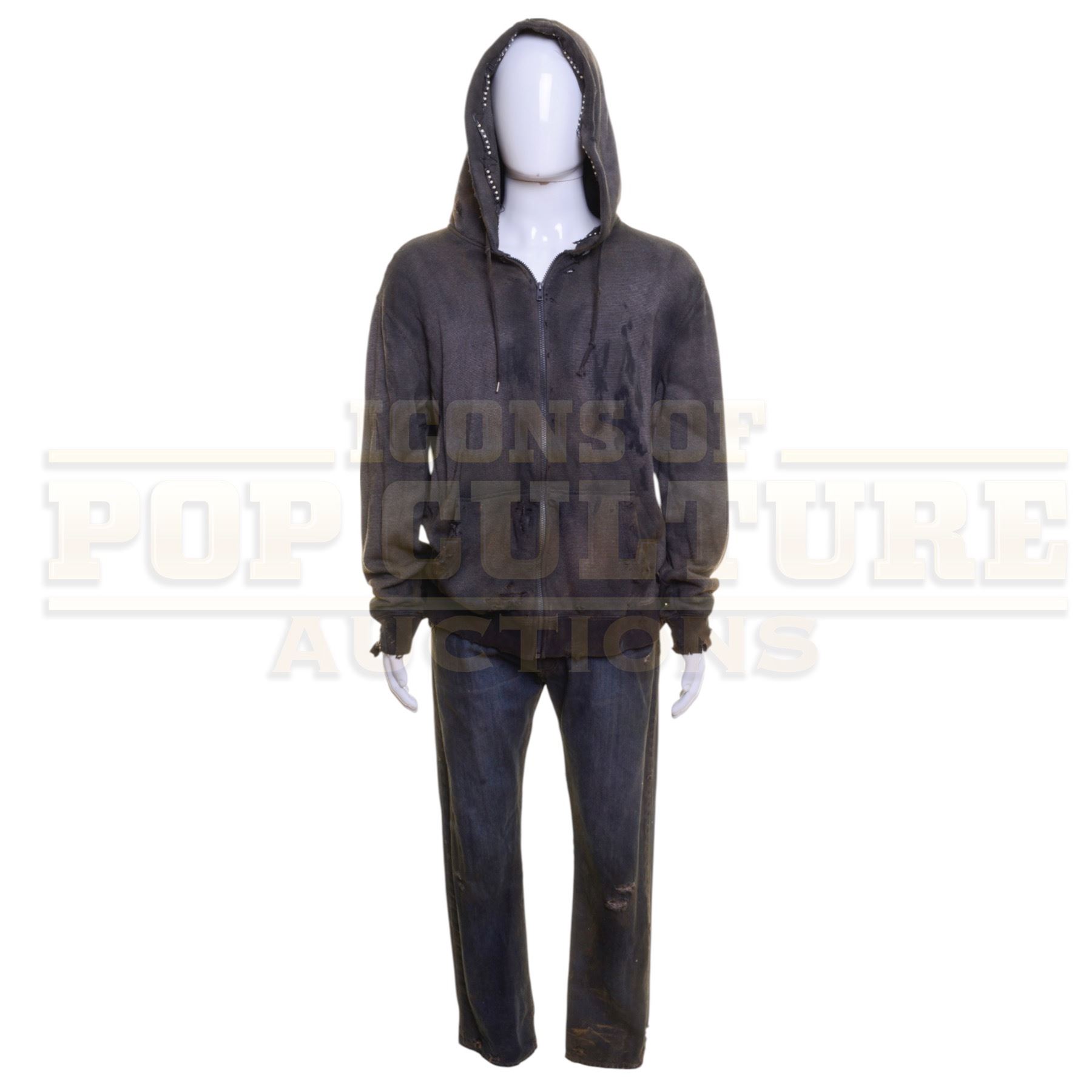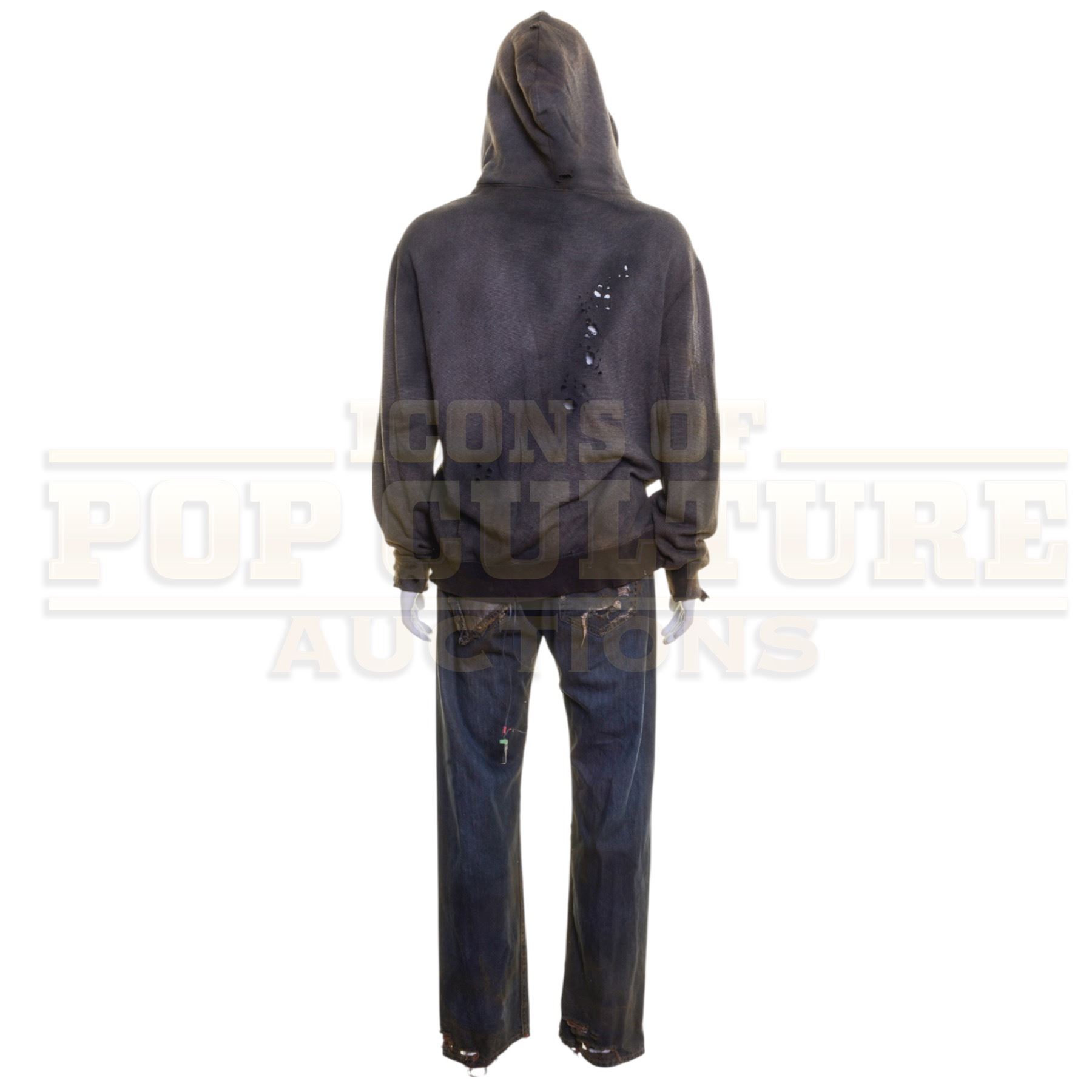 • A heavily distressed black zip-up hoodie with faux burn holes and grime added throughout, including LED light strips sewn into the interior of the hood. The LEDs were designed to illuminate the inside of the hood as a practical lighting effect during filming. While the lights and wiring remain intact, the power source is no longer present and the lights have not been tested.
