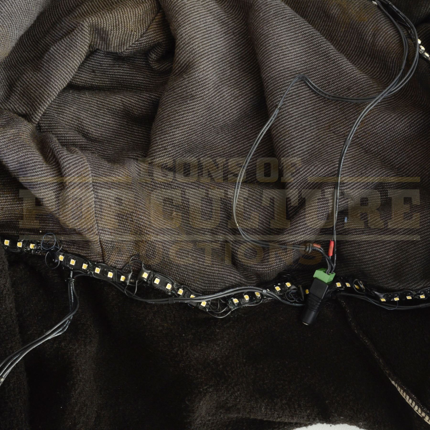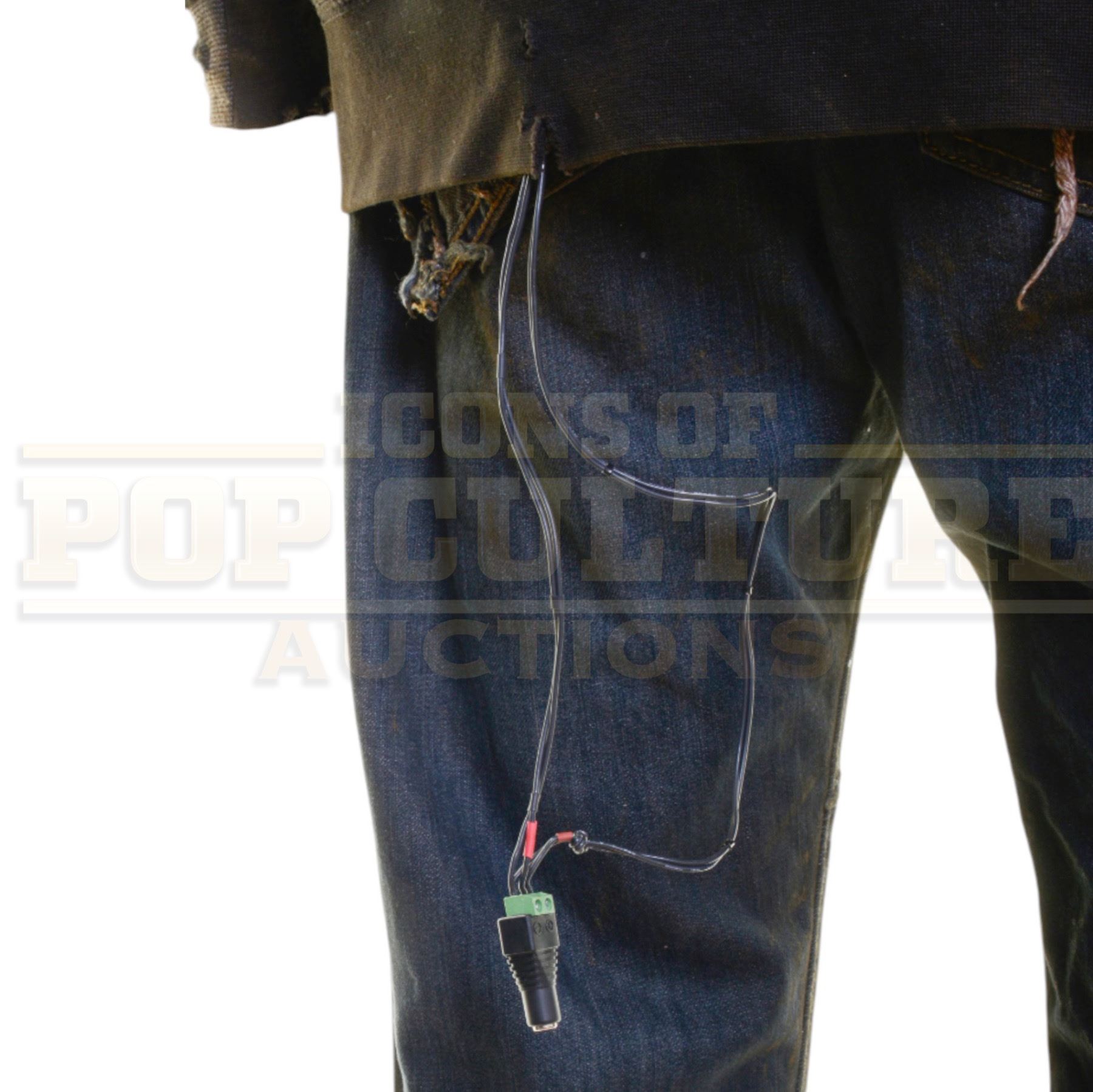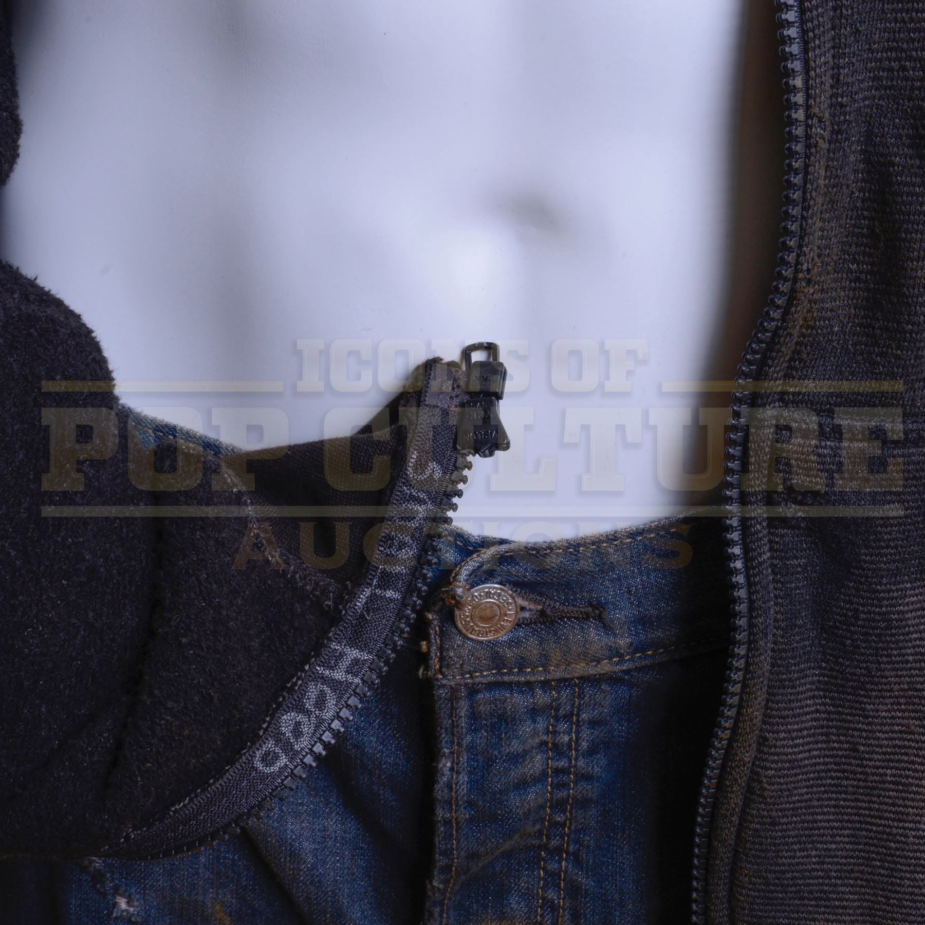 • A heavily distressed black zip-up hoodie with faux burn holes and grime added throughout, including LED light strips sewn into the interior of the hood. The LEDs were designed to illuminate the inside of the hood as a practical lighting effect during filming. While the lights and wiring remain intact, the power source is no longer present and the lights have not been tested.