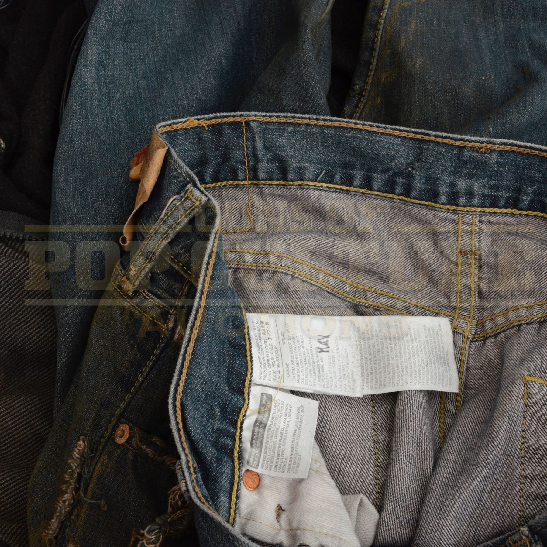 • A pair of distressed blue jeans by Levi’s, also exhibiting dirt and wear from production use.