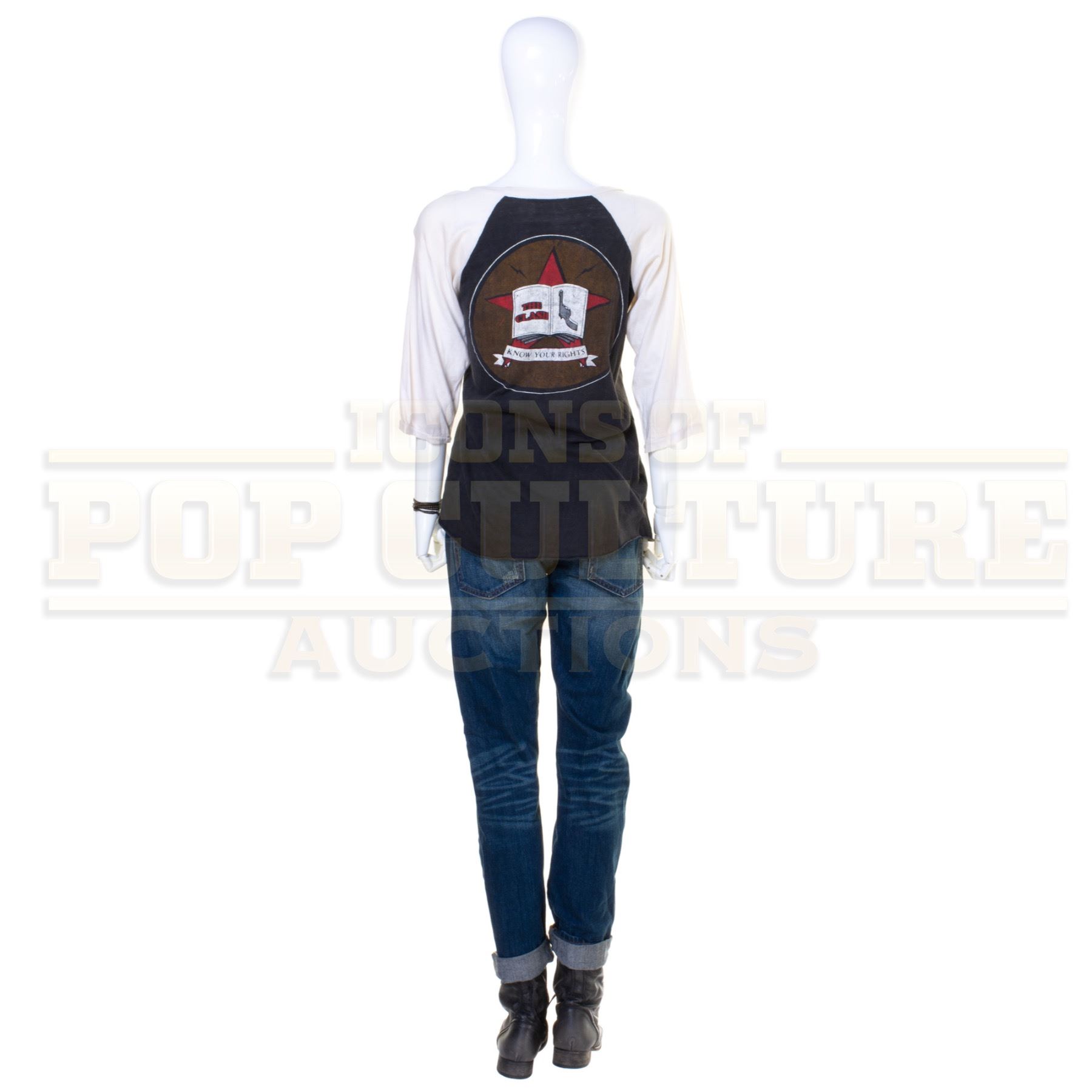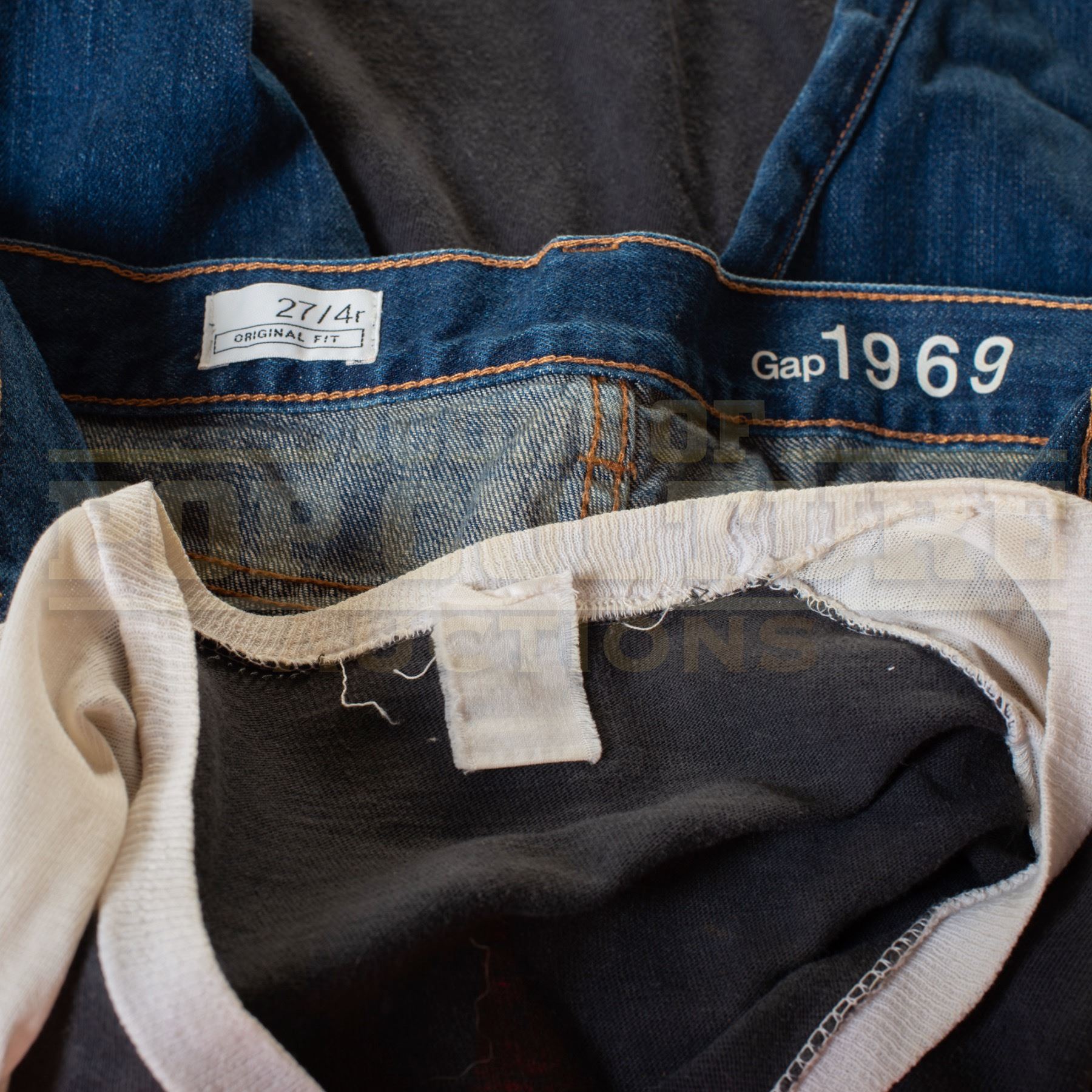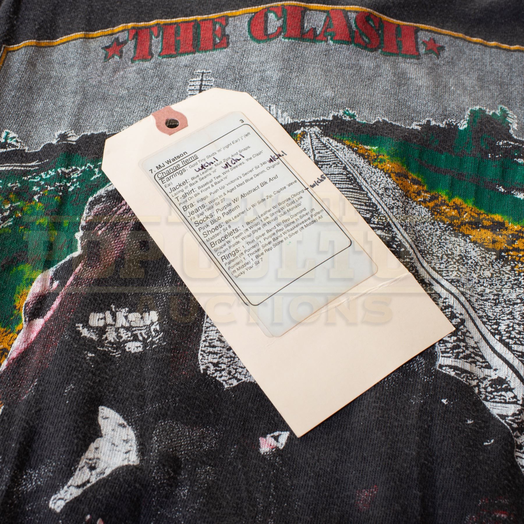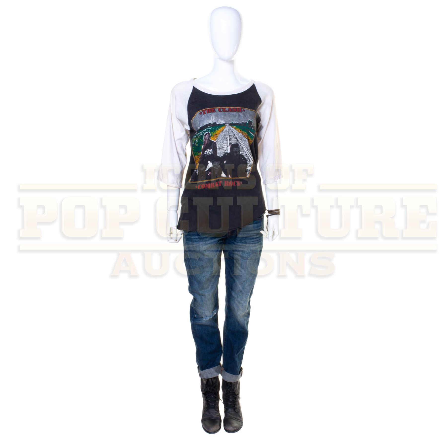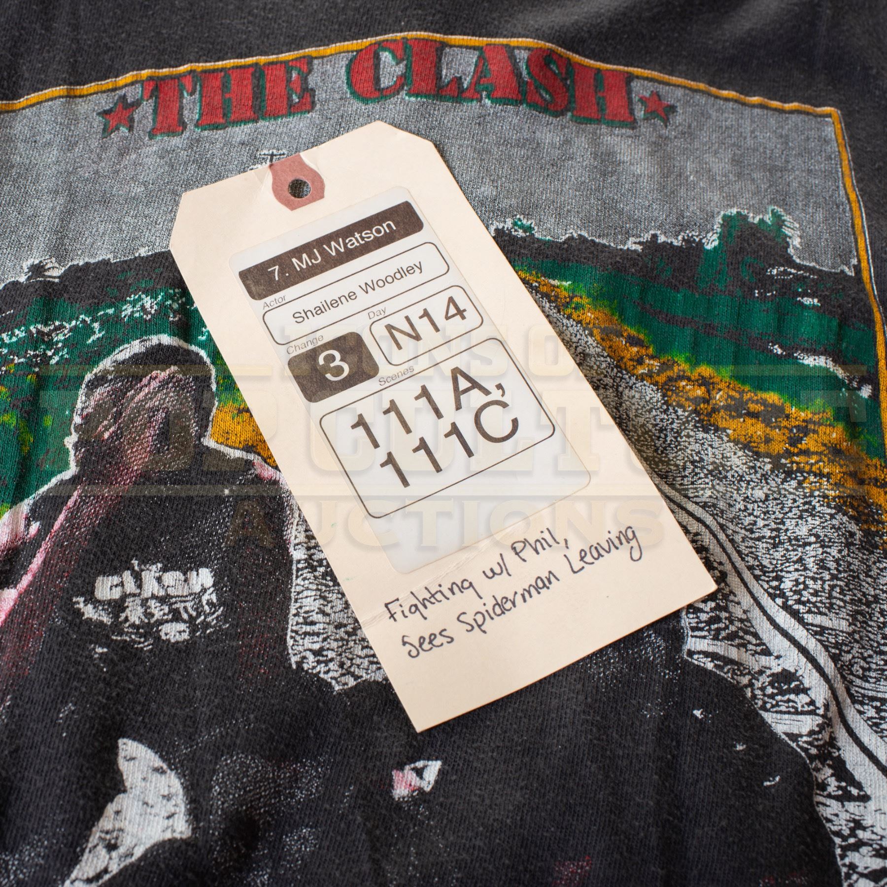 This outfit was acquired by the production for use by Shailene Woodley as “Mary Jane Watson”. The outfit consists of a jersey style t-shirt with “The Clash” graphic on the chest and back, a pair of denim jeans, a wrap style bracelet and a pair of distressed black ankle boots. Included with the outfit is a production used costume tag that details the entire outfit, change and scene numbers used. Shailene Woodley, who filmed scenes as Mary Jane Watson before this character was cut from the film, can be seen briefly near the film's climax. She can be seen from behind during a shot inside a café just as Rhino prepares his attack and after Peter's listened to Gwen's graduation speech.