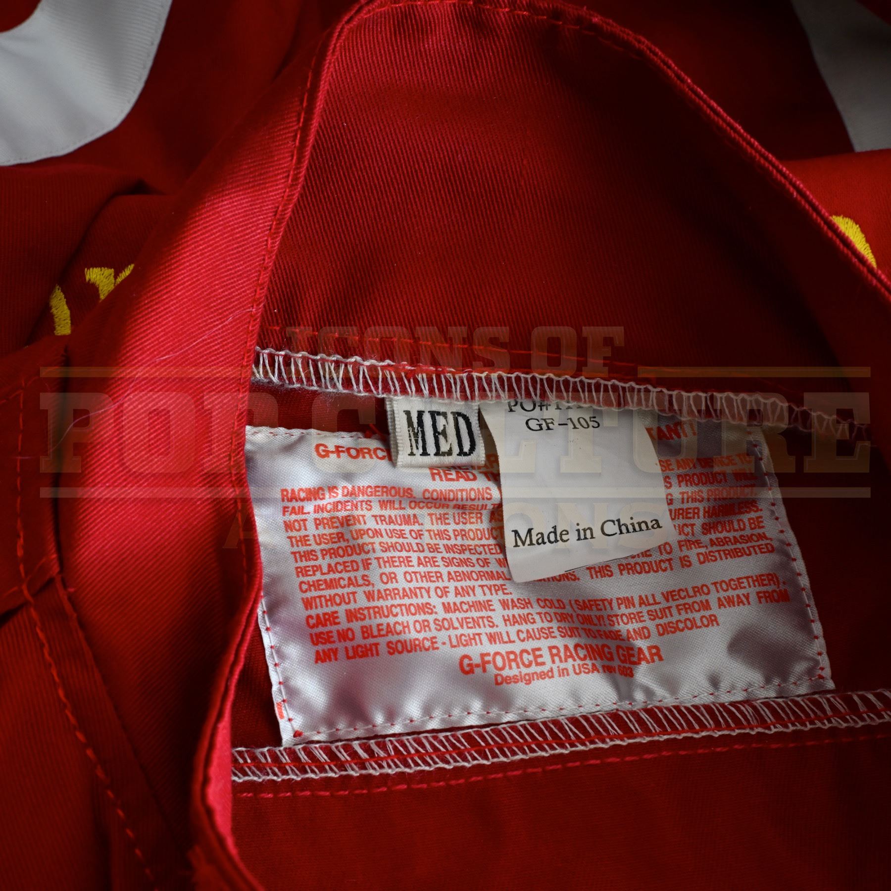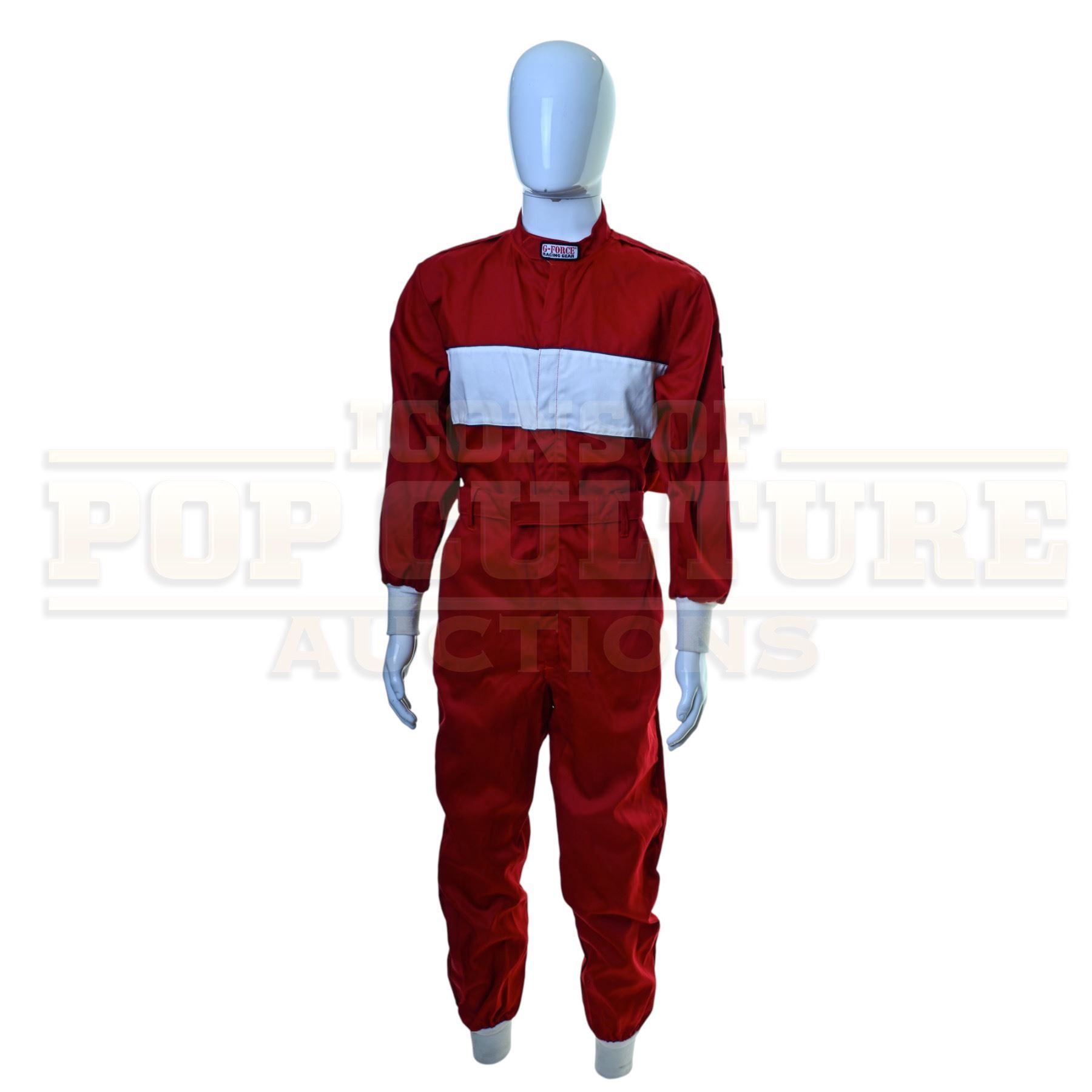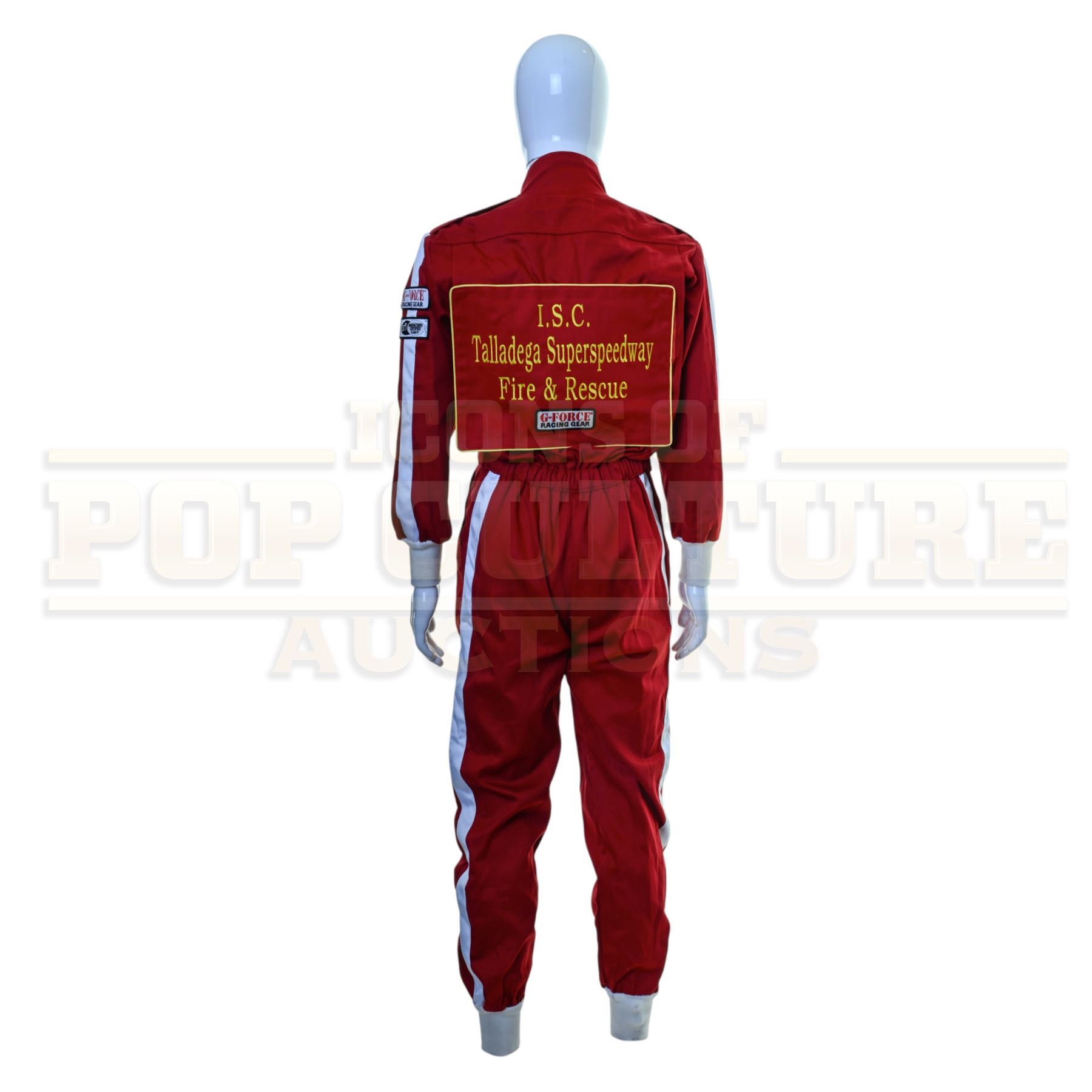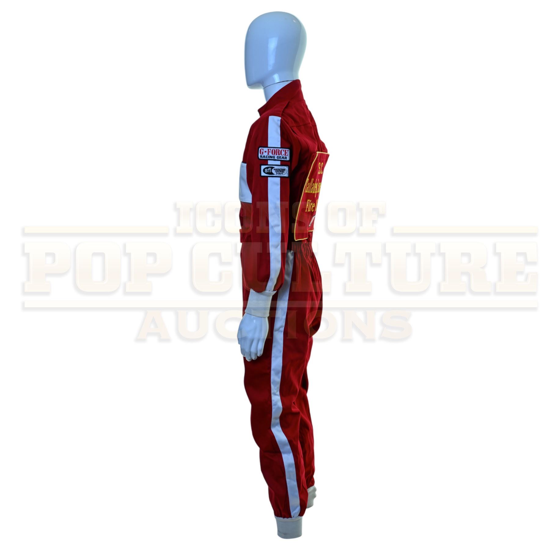 This jumpsuit was acquired by the production for use by various extras as “Fire Rescue Personal”. The red jumpsuit features a large “Lowe’s Motor Speedway Fire & Rescue” patch applied to the back, small “G-Force Racing Gear” patches applied to the collar, left arm and back and a “sfi Manufacturer Certified” patch applied to the left arm.